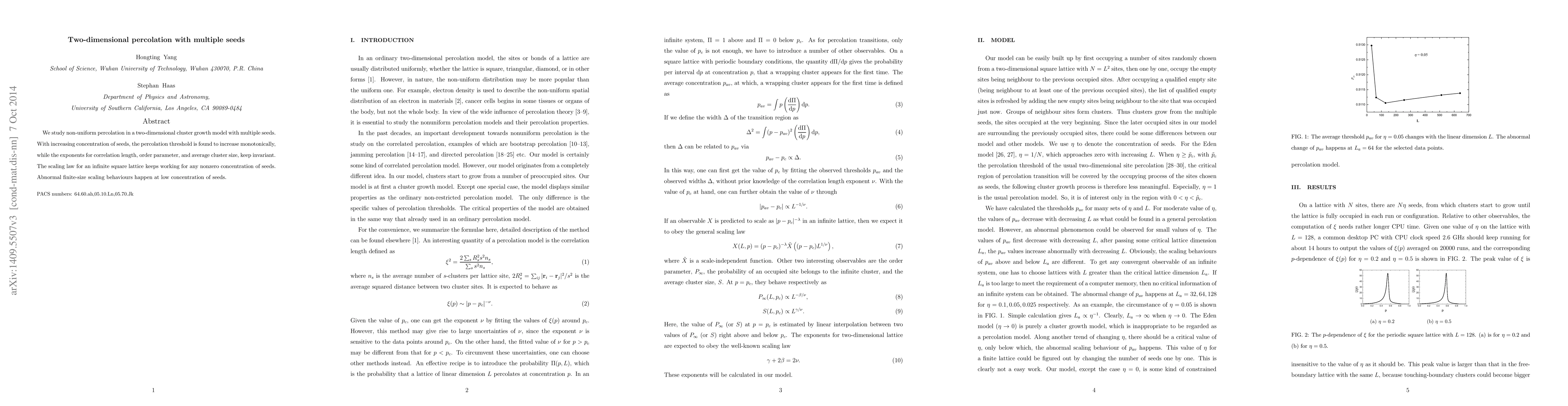 We study non-uniform percolation in a two-dimensional cluster growth model with multiple seeds. With increasing concentration of seeds, the percolation threshold is found to increase monotonically, while the exponents for correlation length, order parameter, and average cluster size, keep invariant. The scaling law for an infinite square lattice keeps working for any nonzero concentration of seeds. Abnormal finite-size scaling behaviours happen at low concentration of seeds.