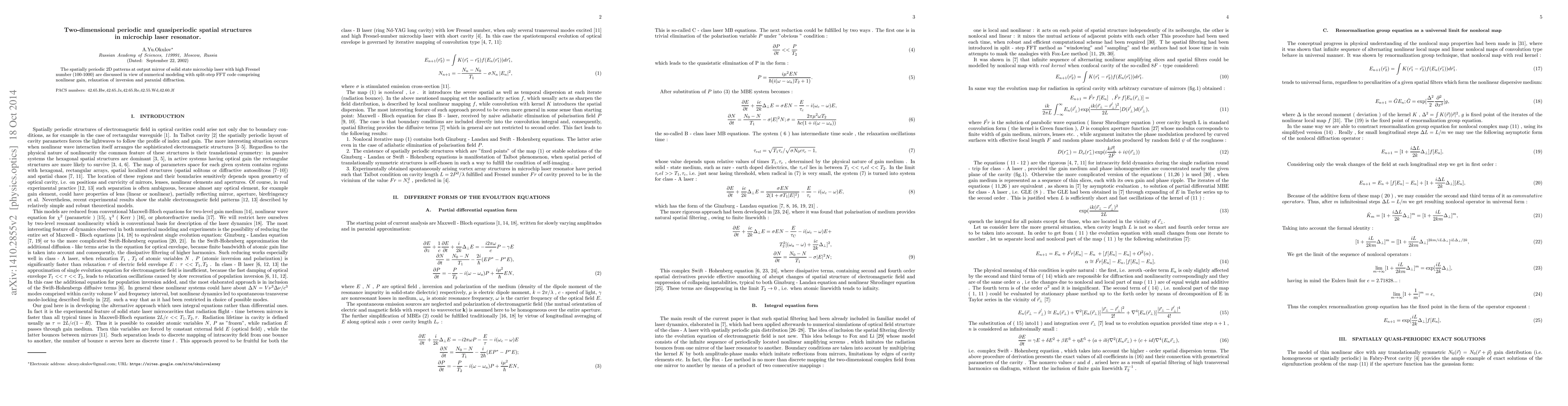 Summary: This paper investigates spatially periodic and quasiperiodic patterns in a microchip laser using numerical modeling, focusing on the effects of high Fresnel number, nonlinear gain, inversion relaxation, and paraxial diffraction. The study reveals complex 2D structures at the laser's output mirror.