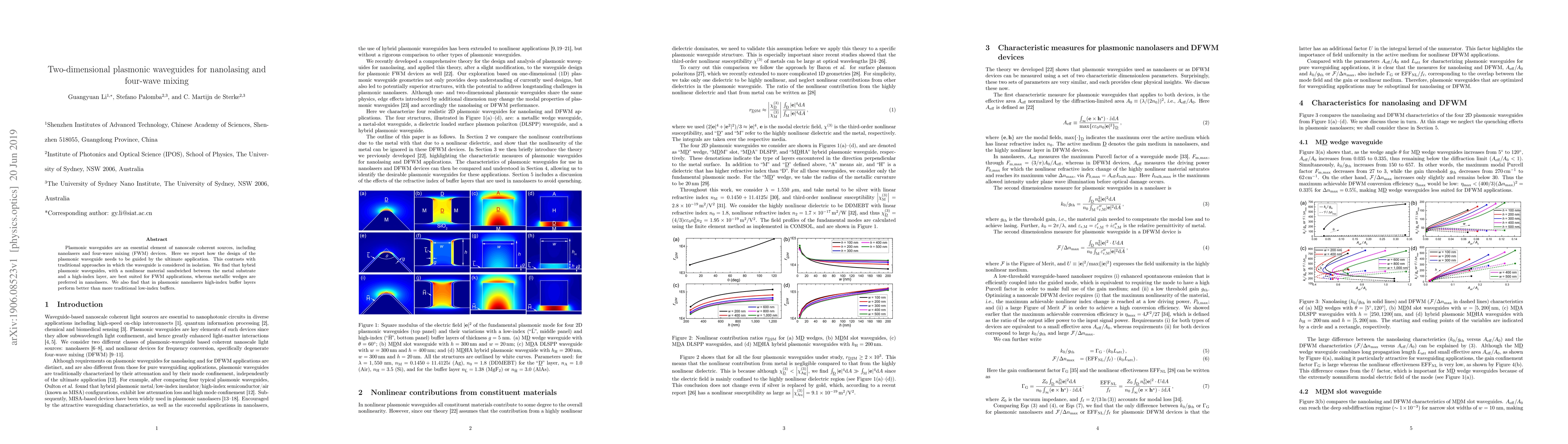 This paper discusses the design of two-dimensional plasmonic waveguides tailored for nanolasing and four-wave mixing. It finds that hybrid plasmonic waveguides with nonlinear materials are optimal for four-wave mixing, while metallic wedges are preferred for nanolasers, and high-index buffer layers enhance plasmonic nanolaser performance.