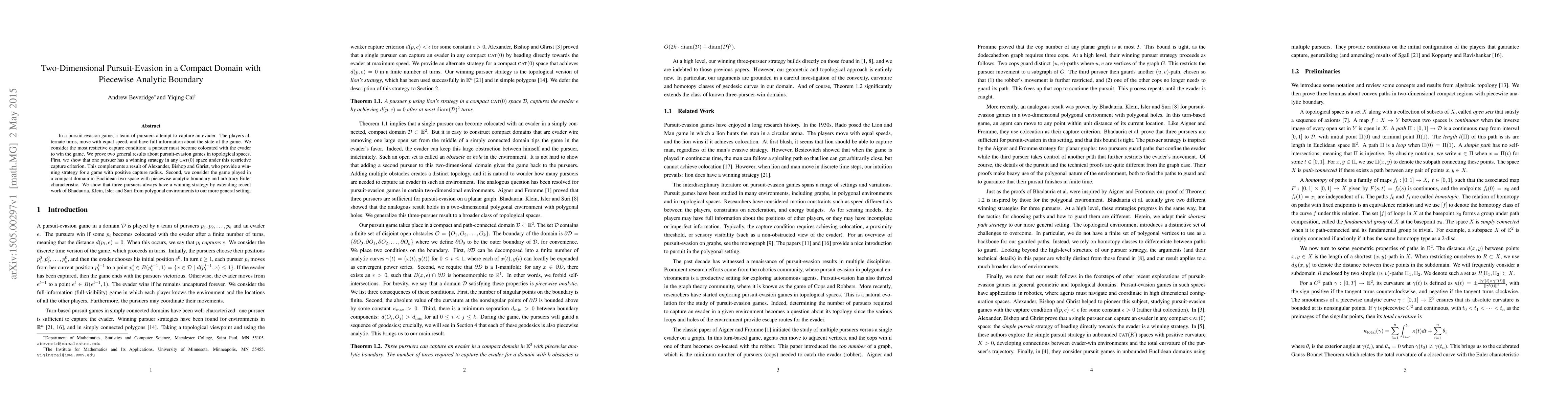 In a pursuit-evasion game, a team of pursuers attempt to capture an evader. The players alternate turns, move with equal speed, and have full information about the state of the game. We consider the most restictive capture condition: a pursuer must become colocated with the evader to win the game. We prove two general results about pursuit-evasion games in topological spaces. First, we show that one pursuer has a winning strategy in any CAT(0) space under this restrictive capture criterion. This complements a result of Alexander, Bishop and Ghrist, who provide a winning strategy for a game with positive capture radius. Second, we consider the game played in a compact domain in Euclidean two-space with piecewise analytic boundary and arbitrary Euler characteristic. We show that three pursuers always have a winning strategy by extending recent work of Bhadauria, Klein, Isler and Suri from polygonal environments to our more general setting.
