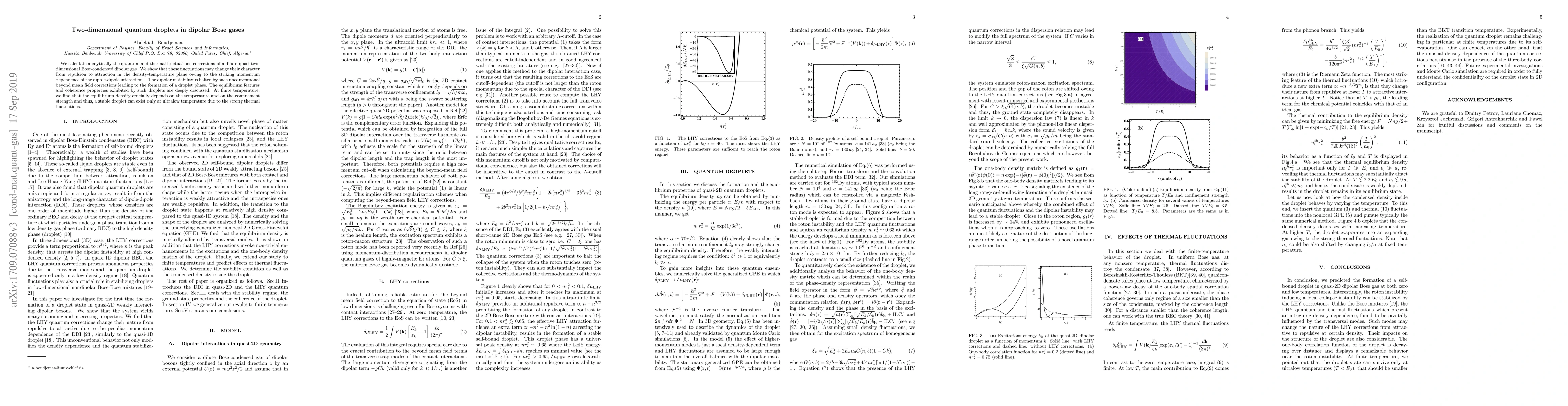 This paper analytically investigates quantum and thermal fluctuations in quasi-two-dimensional dipolar Bose gases, revealing that dipole-dipole interactions can shift from repulsive to attractive, leading to the formation of quantum droplets. These droplets are stable only at ultralow temperatures due to strong thermal fluctuations.