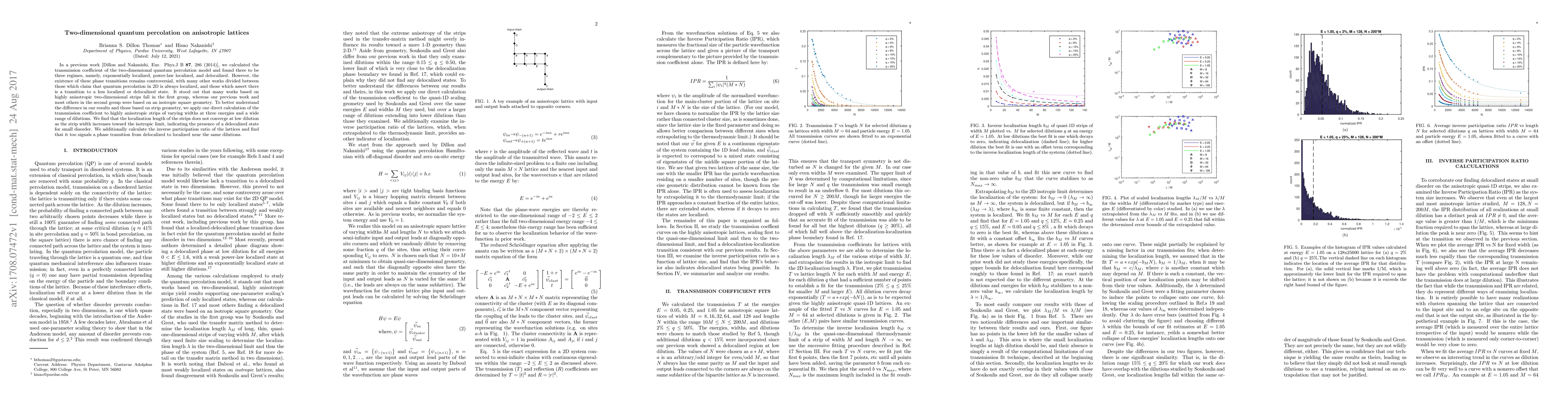 This research investigates two-dimensional quantum percolation on anisotropic lattices, finding evidence for a delocalized state at low disorder in contrast to localized behavior in highly anisotropic strips. The study uses transmission coefficient calculations and inverse participation ratios, revealing a phase transition near specific dilution levels.