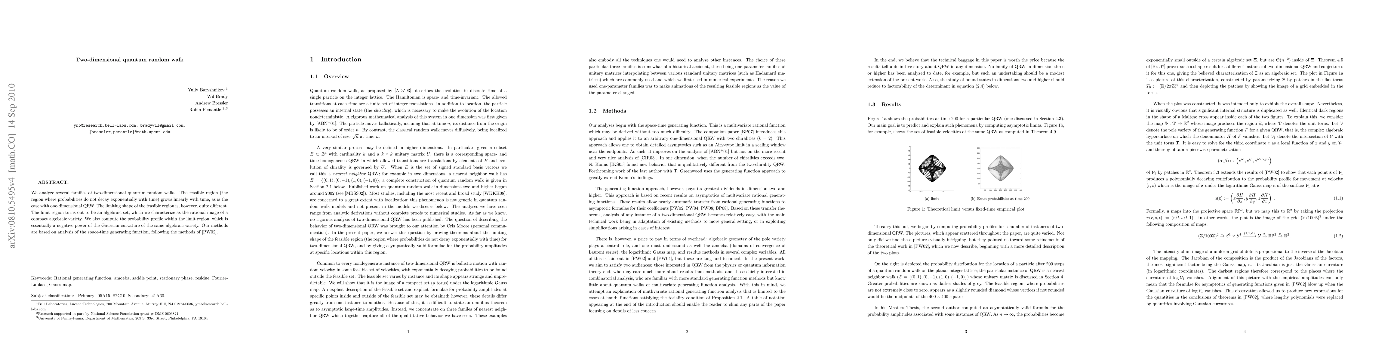 We analyze several families of two-dimensional quantum random walks. The feasible region (the region where probabilities do not decay exponentially with time) grows linearly with time, as is the case with one-dimensional QRW. The limiting shape of the feasible region is, however, quite different. The limit region turns out to be an algebraic set, which we characterize as the rational image of a compact algebraic variety. We also compute the probability profile within the limit region, which is essentially a negative power of the Gaussian curvature of the same algebraic variety. Our methods are based on analysis of the space-time generating function, following the methods of Pemantle and Wilson (2002).