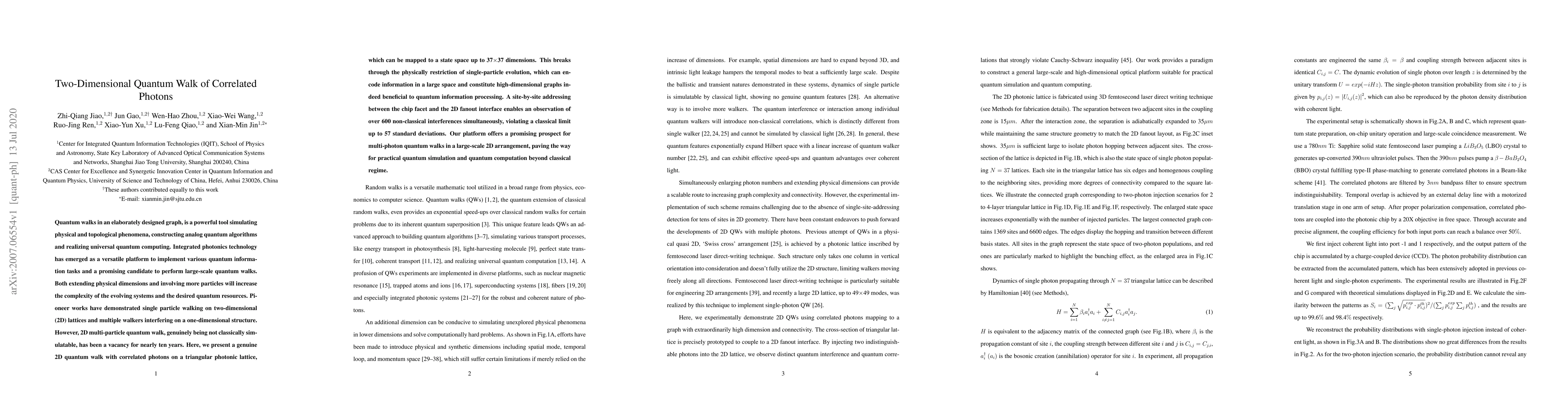 This paper demonstrates a genuine two-dimensional quantum walk using correlated photons on a triangular photonic lattice, enabling high-dimensional quantum information processing. The experiment observes over 600 non-classical interferences, surpassing classical limits, and suggests a scalable platform for large-scale quantum walks and quantum computation.