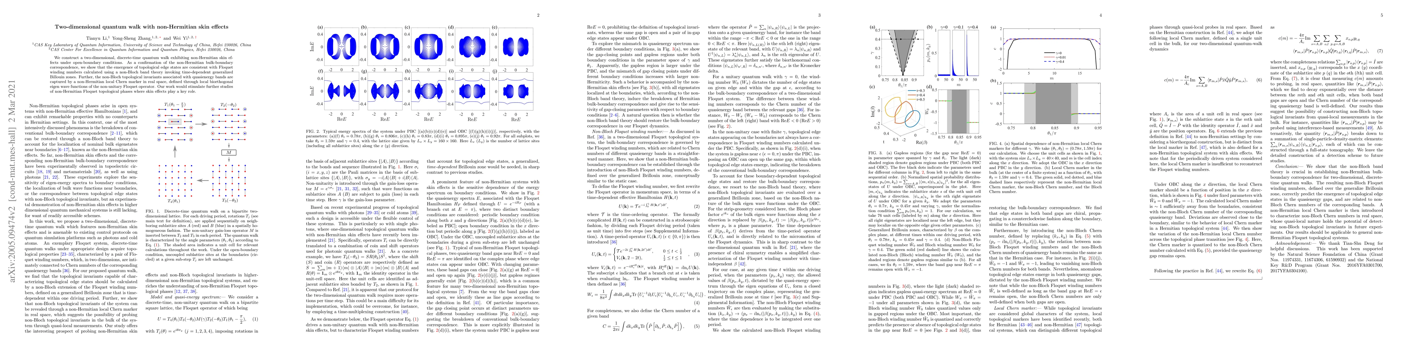 This paper constructs a two-dimensional quantum walk demonstrating non-Hermitian skin effects, confirming topological edge states through non-Bloch band theory and a non-Hermitian local Chern marker. The study highlights the potential for exploring non-Hermitian Floquet topological phases.