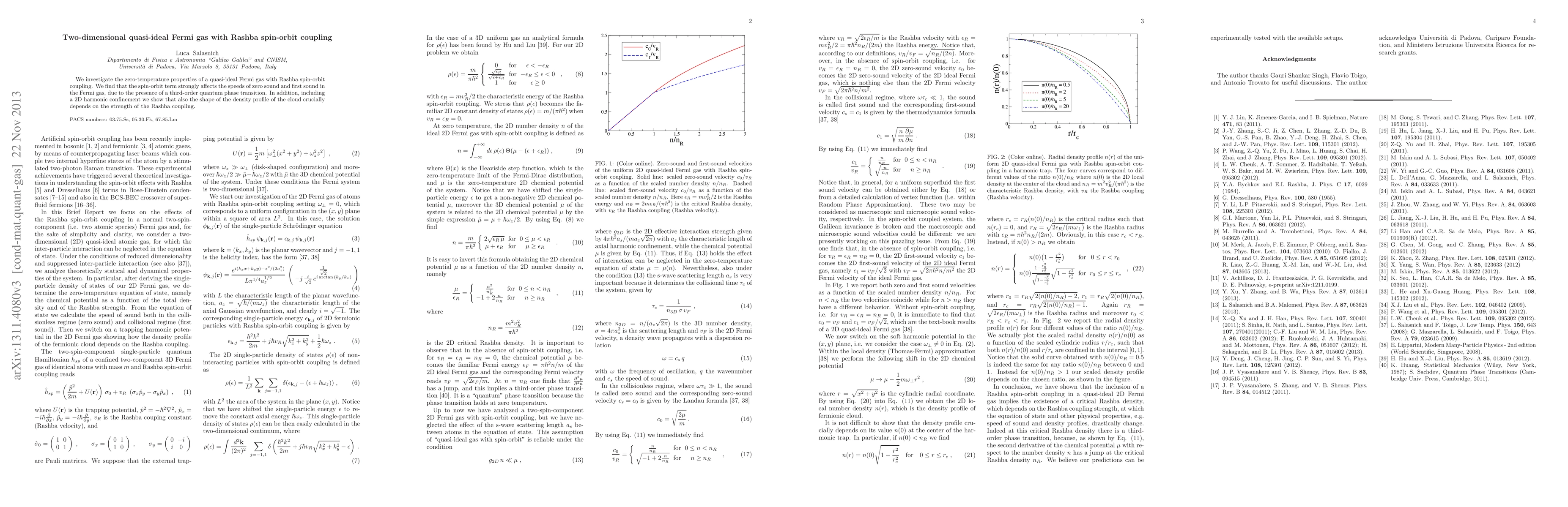 This paper examines a quasi-ideal Fermi gas with Rashba spin-orbit coupling, revealing that the spin-orbit term significantly influences the speeds of zero sound and first sound due to a third-order quantum phase transition. The study also demonstrates that the density profile shape of the gas cloud is critically dependent on the strength of the Rashba coupling when subjected to a 2D harmonic confinement.