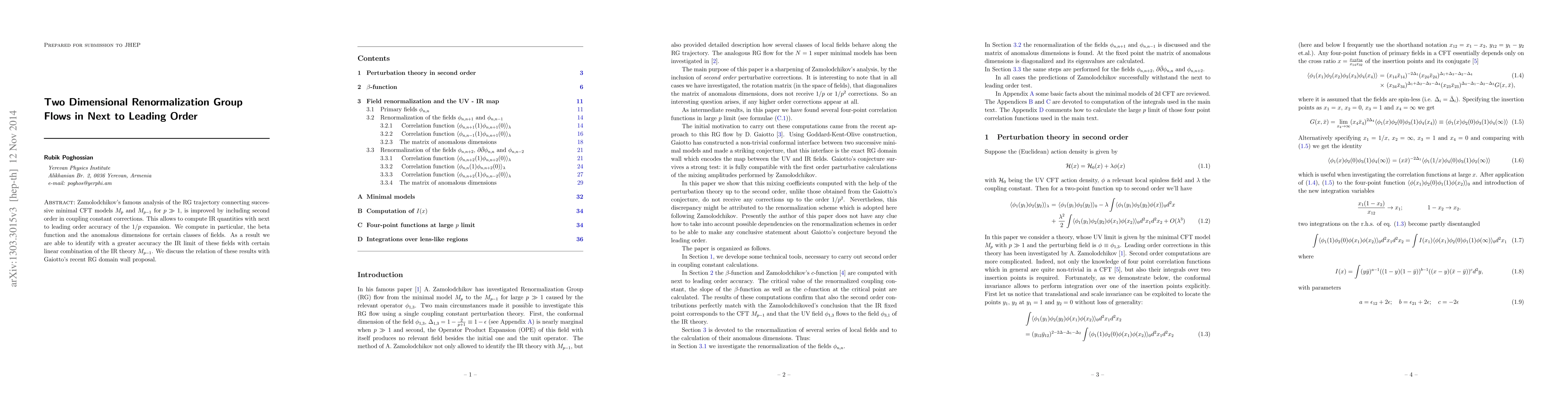 Zamolodchikov's famous analysis of the RG trajectory connecting successive minimal CFT models $M_p$ and $M_{p-1}$ for $p\gg 1$, is improved by including second order in coupling constant corrections. This allows to compute IR quantities with next to leading order accuracy of the $1/p$ expansion. We compute in particular, the beta function and the anomalous dimensions for certain classes of fields. As a result we are able to identify with a greater accuracy the IR limit of these fields with certain linear combination of the IR theory $M_{p-1}$. We discuss the relation of these results with Gaotto's recent RG domain wall proposal.
