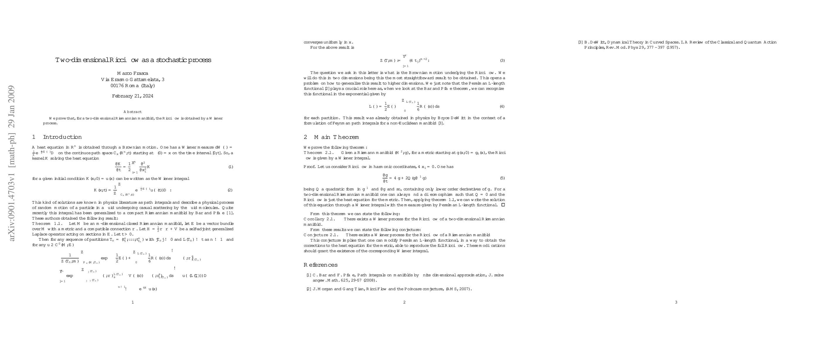 This paper establishes that two-dimensional Ricci flow, a process used in geometry to smooth out the shape of a manifold, can be modeled as a Wiener process, a type of stochastic or random process. This finding bridges differential geometry and stochastic processes, potentially offering new analytical tools in studying geometric evolution.