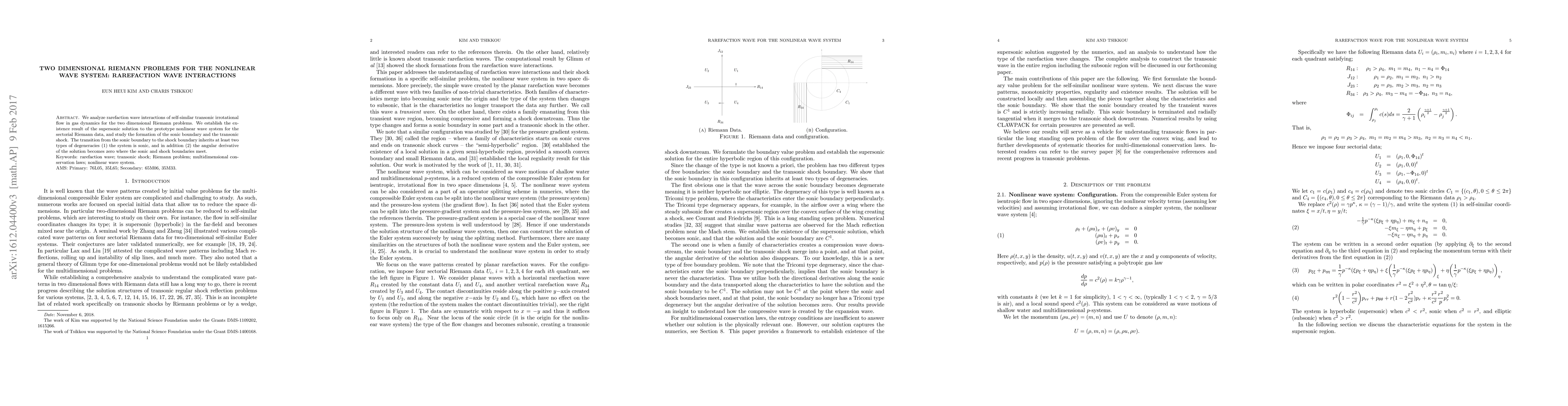 This paper investigates rarefaction wave interactions in two-dimensional Riemann problems for nonlinear wave systems in gas dynamics, establishing the existence of supersonic solutions for sectorial data. It examines the formation of sonic boundaries and transonic shocks, highlighting two types of degeneracies in the transition from sonic to shock boundaries.