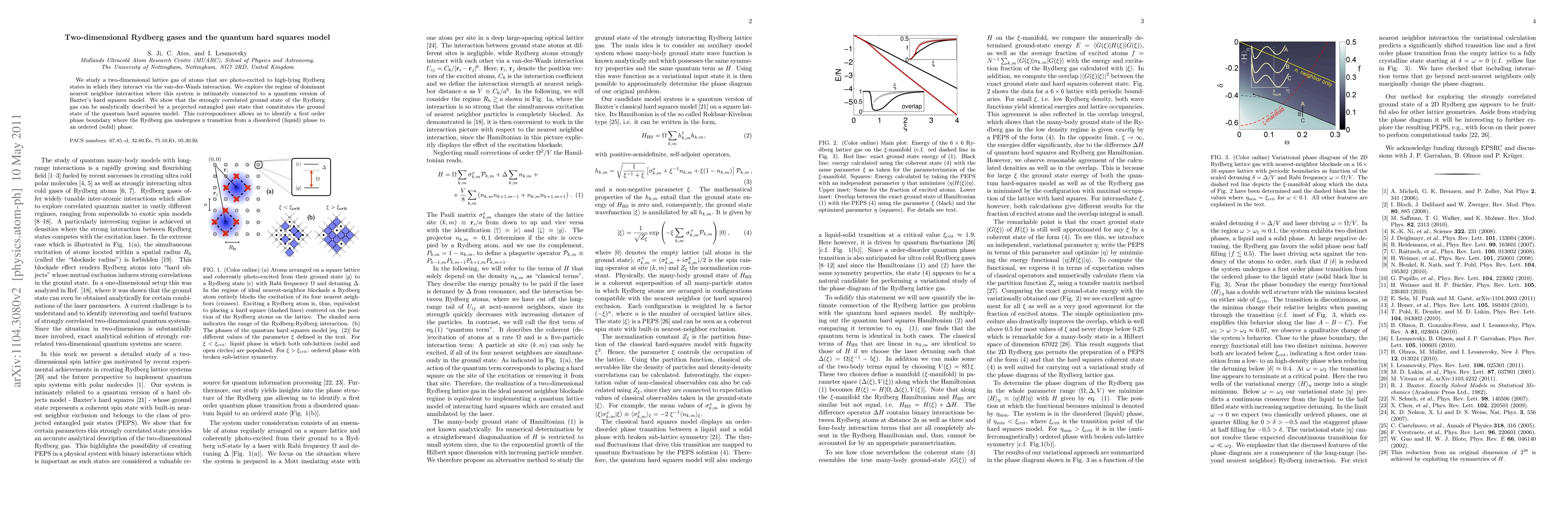 We study a two-dimensional lattice gas of atoms that are photo-excited to high-lying Rydberg states in which they interact via the van-der-Waals interaction. We explore the regime of dominant nearest neighbor interaction where this system is intimately connected to a quantum version of Baxter's hard squares model. We show that the strongly correlated ground state of the Rydberg gas can be analytically described by a projected entangled pair state that constitutes the ground state of the quantum hard squares model. This correspondence allows us to identify a first order phase boundary where the Rydberg gas undergoes a transition from a disordered (liquid) phase to an ordered (solid) phase.