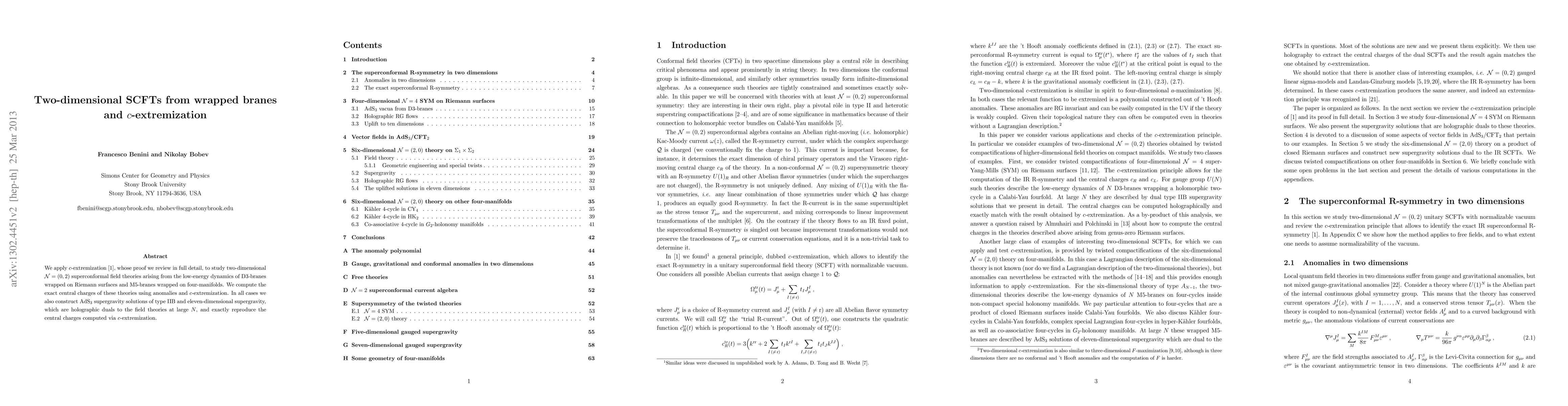 We apply c-extremization, whose proof we review in full detail, to study two-dimensional N=(0,2) superconformal field theories arising from the low-energy dynamics of D3-branes wrapped on Riemann surfaces and M5-branes wrapped on four-manifolds. We compute the exact central charges of these theories using anomalies and c-extremization. In all cases we also construct AdS_3 supergravity solutions of type IIB and eleven-dimensional supergravity, which are holographic duals to the field theories at large N, and exactly reproduce the central charges computed via c-extremization.
