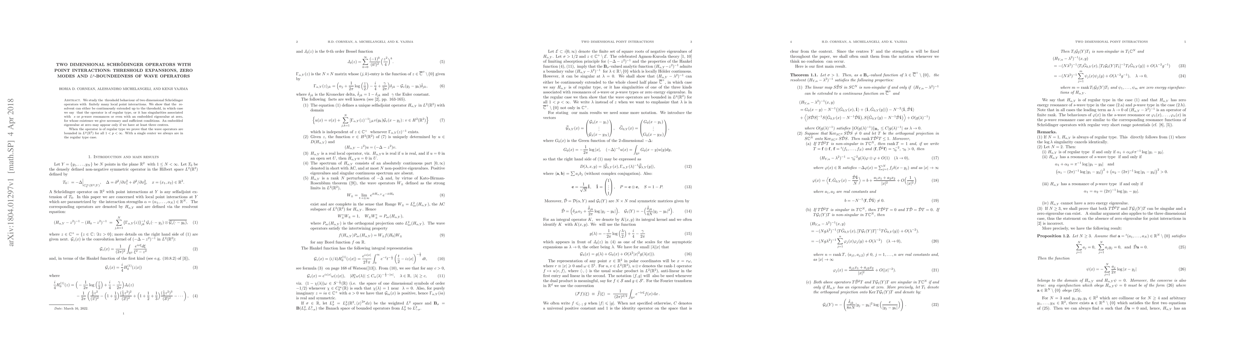 This paper investigates two-dimensional Schrödinger operators with point interactions, exploring their threshold behavior and the presence of zero modes. It establishes conditions for the existence of embedded eigenvalues at zero and proves $L^p$-boundedness of wave operators for regular type operators.