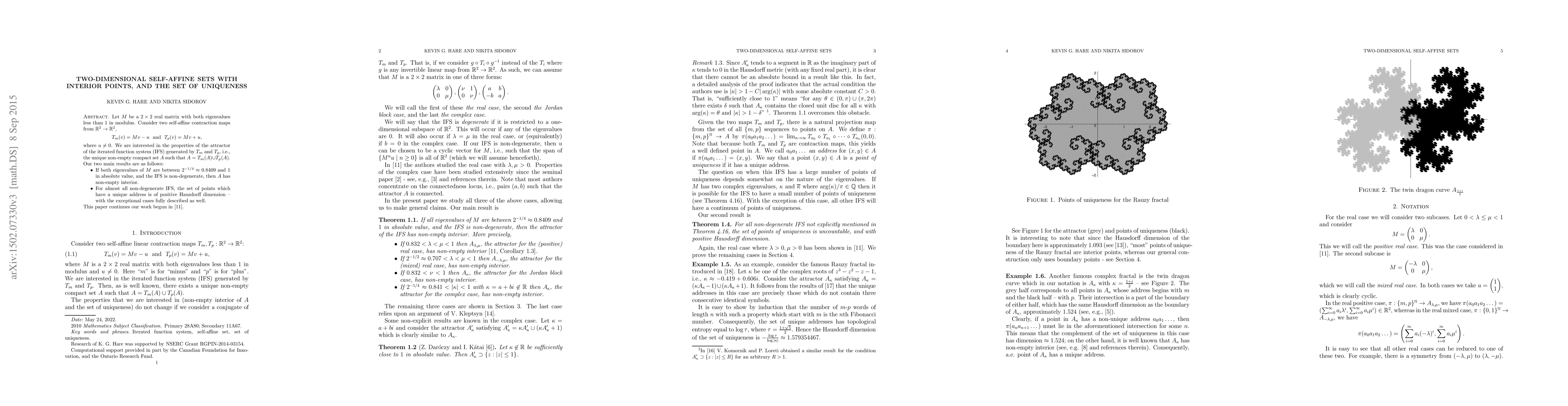 This paper investigates the properties of self-affine sets generated by two contraction maps with a non-zero translation vector. It shows that under certain conditions on the matrix, the attractor has a non-empty interior, and almost all non-degenerate systems have a set of unique points with positive Hausdorff dimension.