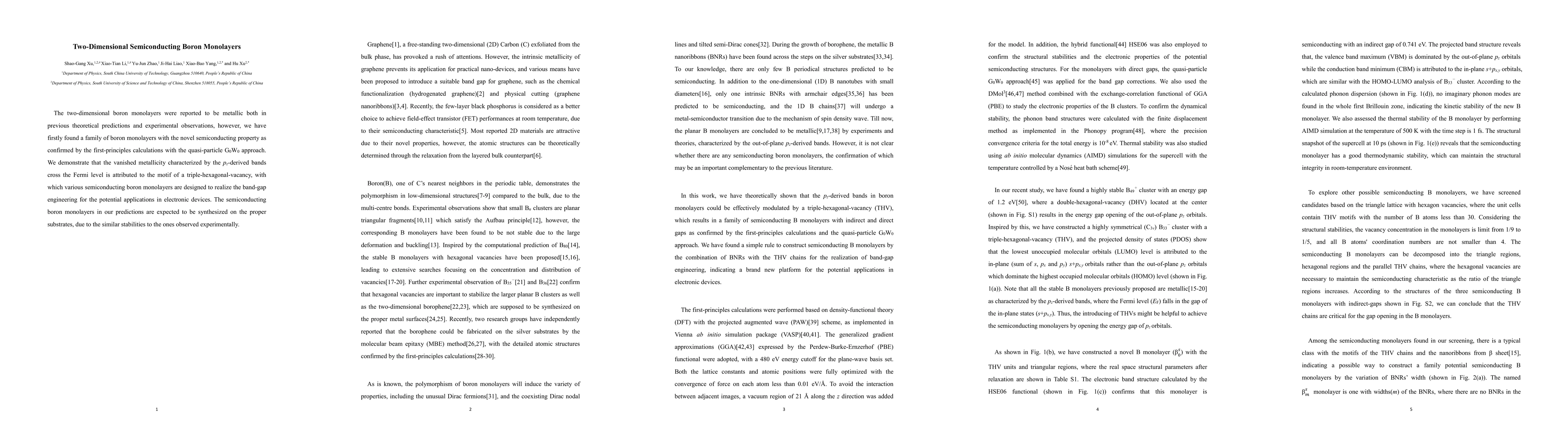 The two-dimensional boron monolayers were reported to be metallic both in previous theoretical predictions and experimental observations, however, we have firstly found a family of boron monolayers with the novel semiconducting property as confirmed by the first-principles calculations with the quasi-particle G0W0 approach. We demonstrate that the vanished metallicity characterized by the pz-derived bands cross the Fermi level is attributed to the motif of a triple-hexagonal-vacancy, with which various semiconducting boron monolayers are designed to realize the band-gap engineering for the potential applications in electronic devices. The semiconducting boron monolayers in our predictions are expected to be synthesized on the proper substrates, due to the similar stabilities to the ones observed experimentally.