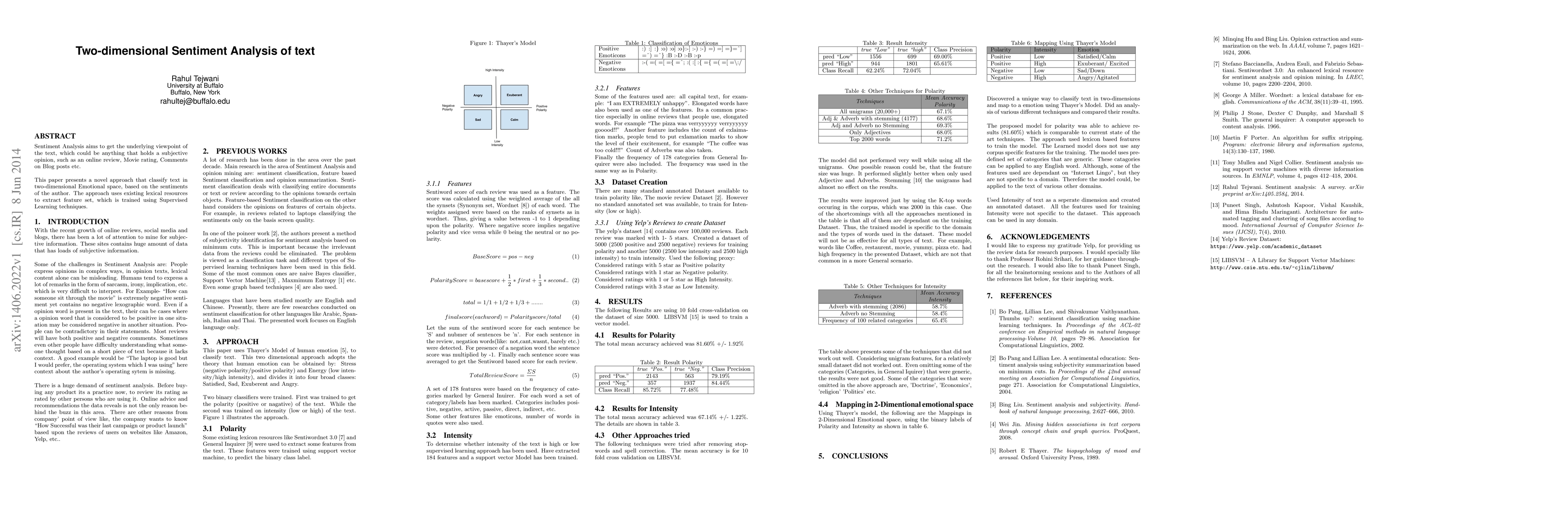 This paper proposes a two-dimensional sentiment analysis approach, classifying text based on author's emotions using lexical resources and supervised learning techniques.