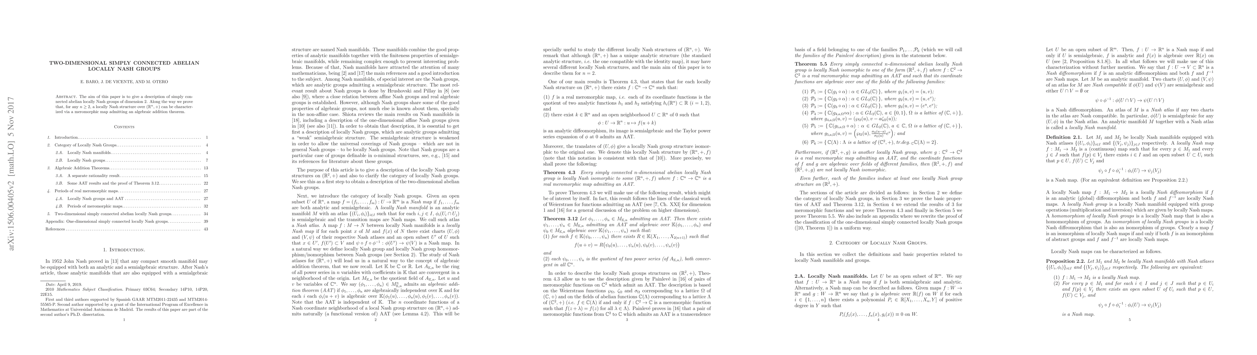 This paper describes simply connected abelian locally Nash groups of dimension 2 and proves that any locally Nash structure over $(\mathbb{R}^n,+)$ can be characterized by a meromorphic map with an algebraic addition theorem.