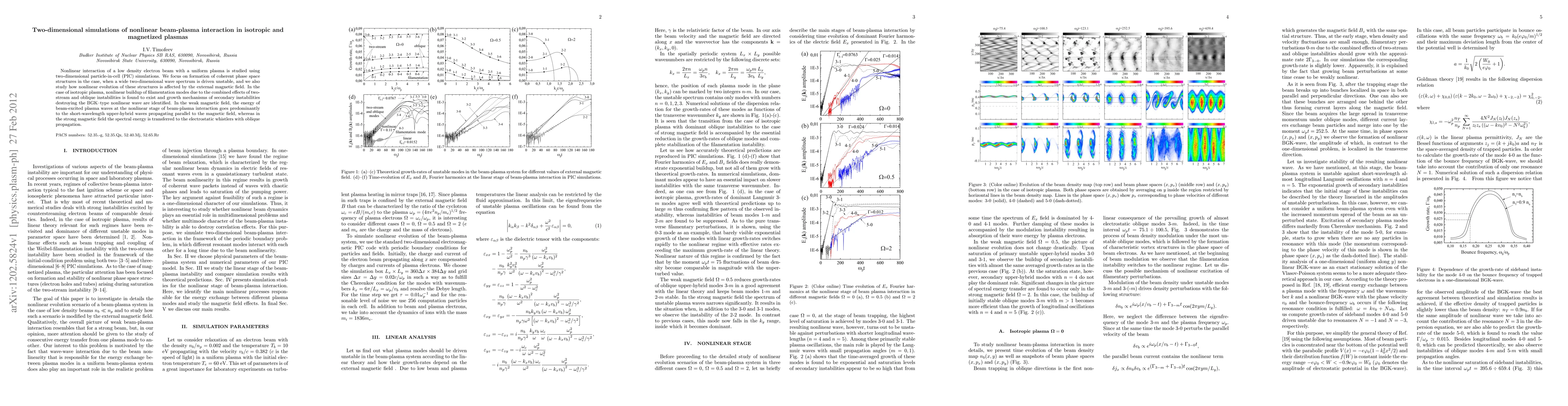 This paper uses two-dimensional PIC simulations to study the nonlinear beam-plasma interaction in both isotropic and magnetized plasmas, focusing on coherent phase space structures and the influence of external magnetic fields on wave spectrum evolution. The study reveals distinct energy transfer mechanisms in weak versus strong magnetic fields.
