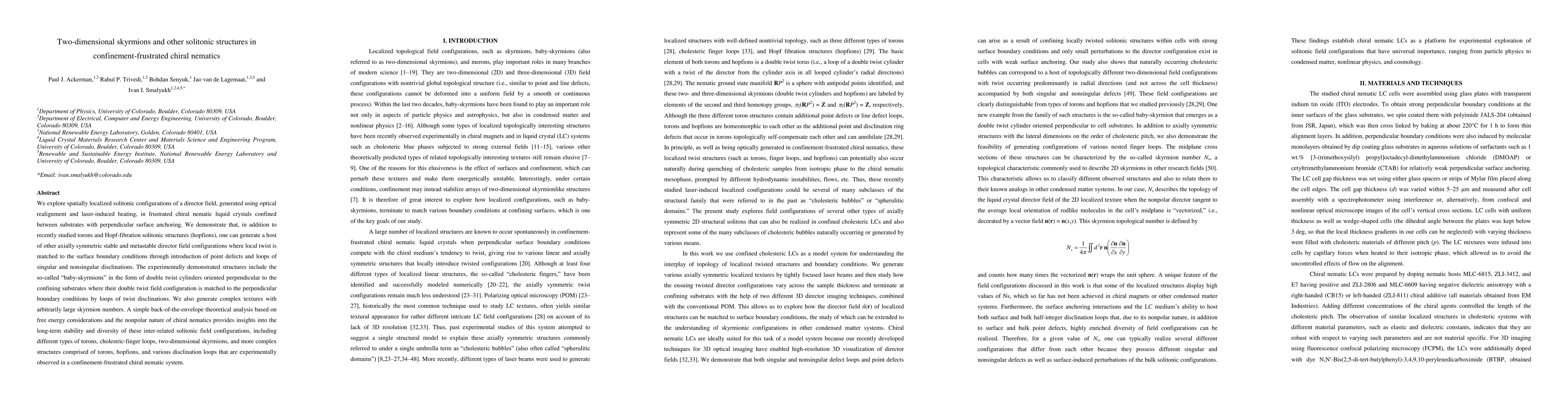 We explore spatially localized solitonic configurations of a director field, generated using optical realignment and laser-induced heating, in frustrated chiral nematic liquid crystals confined between substrates with perpendicular surface anchoring. We demonstrate that, in addition to recently studied torons and Hopf-fibration solitonic structures (hopfions), one can generate a host of other axially symmetric stable and metastable director field configurations where local twist is matched to the surface boundary conditions through introduction of point defects and loops of singular and nonsingular disclinations. The experimentally demonstrated structures include the so-called "baby-skyrmions" in the form of double twist cylinders oriented perpendicular to the confining substrates where their double twist field configuration is matched to the perpendicular boundary conditions by loops of twist disclinations. We also generate complex textures with arbitrarily large skyrmion numbers. A simple back-of-the-envelope theoretical analysis based on free energy considerations and the nonpolar nature of chiral nematics provides insights into the long-term stability and diversity of these inter-related solitonic field configurations, including different types of torons, cholestric-finger loops, two-dimensional skyrmions, and more complex structures comprised of torons, hopfions, and various disclination loops that are experimentally observed in a confinement-frustrated chiral nematic system.