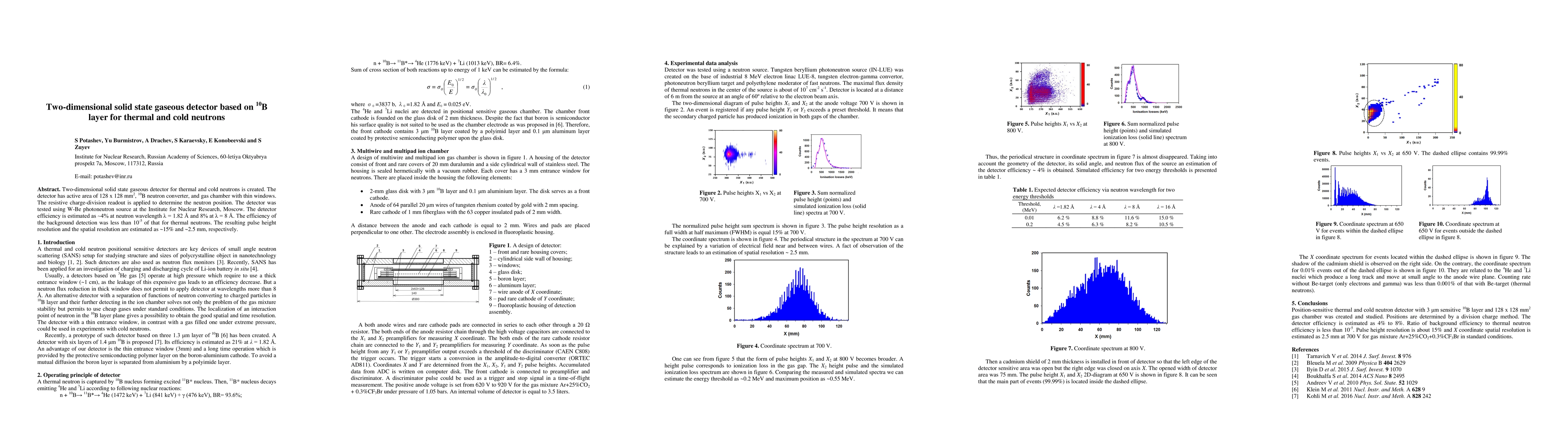 Two-dimensional solid state gaseous detector for thermal and cold neutrons is created. The detector has active area of 128 x 128 $mm^2$, $^{10}B$ neutron converter, and gas chamber with thin windows. The resistive charge-division readout is applied to determine the neutron position. The detector was tested using $W-Be$ photoneutron source at the Institute for Nuclear Research, Moscow. The detector efficiency is estimated as ~4% at neutron wavelength $\lambda = 1.82 \AA$ and 8% at $\lambda = 8 \AA$. The efficiency of the background detection was less than $10^{-5}$ of that for thermal neutrons. The resulting pulse height resolution and the spatial resolution are estimated as $\approx 15\%$ and $\approx 2.5 mm$, respectively.