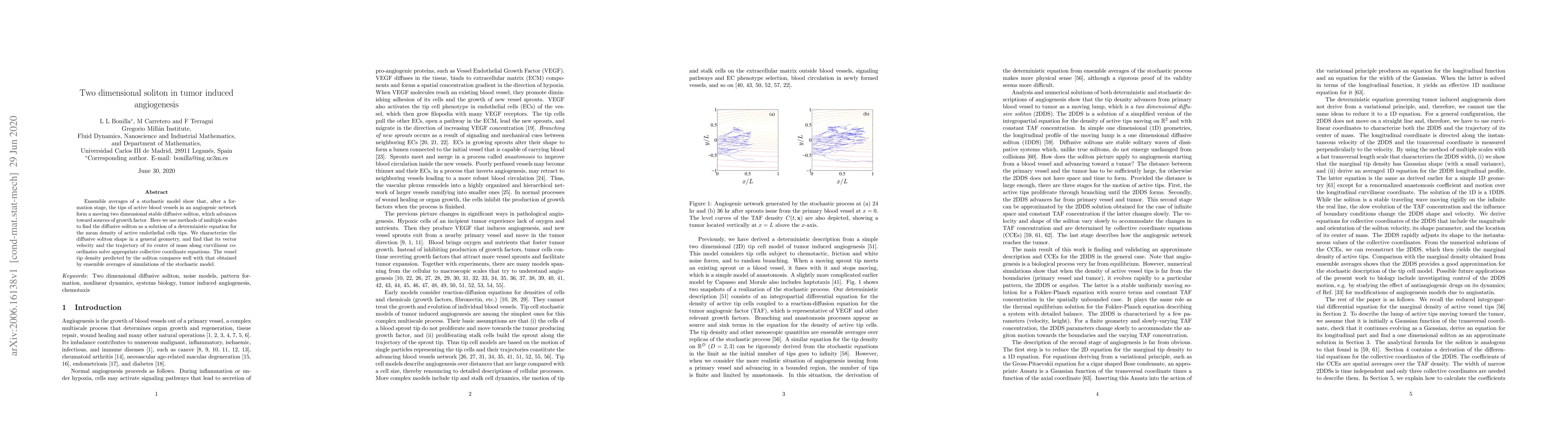Ensemble averages of a stochastic model show that, after a formation stage, the tips of active blood vessels in an angiogenic network form a moving two dimensional stable diffusive soliton, which advances toward sources of growth factor. Here we use methods of multiple scales to find the diffusive soliton as a solution of a deterministic equation for the mean density of active endothelial cells tips. We characterize the diffusive soliton shape in a general geometry, and find that its vector velocity and the trajectory of its center of mass along curvilinear coordinates solve appropriate collective coordinate equations. The vessel tip density predicted by the soliton compares well with that obtained by ensemble averages of simulations of the stochastic model.