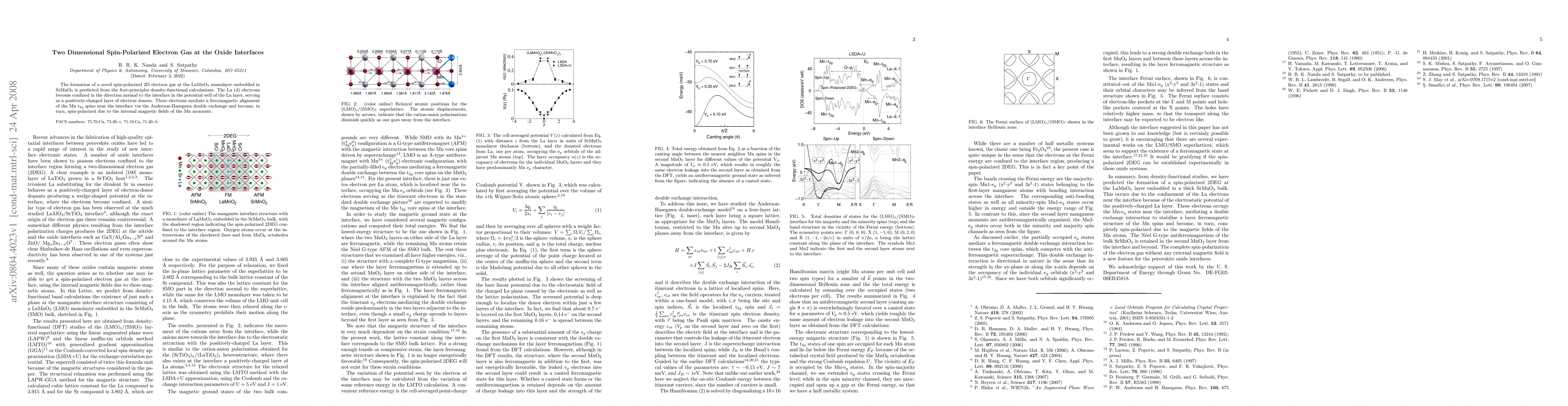 This research predicts the formation of a spin-polarized 2D electron gas at the interface of LaMnO$_3$ embedded in SrMnO$_3$, mediated by the first-principles density-functional calculations. The La (d) electrons create a potential well that confines them, leading to a ferromagnetic alignment of Mn spins via the Anderson-Hasegawa double exchange.