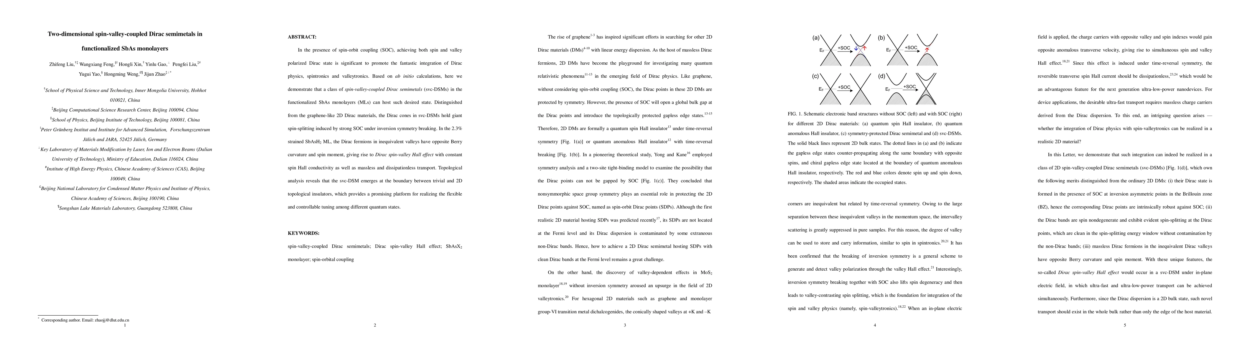 This research demonstrates spin-valley-coupled Dirac semimetals in functionalized SbAs monolayers, showing giant spin-splitting and opposite Berry curvature in strained conditions, which leads to a Dirac spin-valley Hall effect and potential for tunable quantum states.