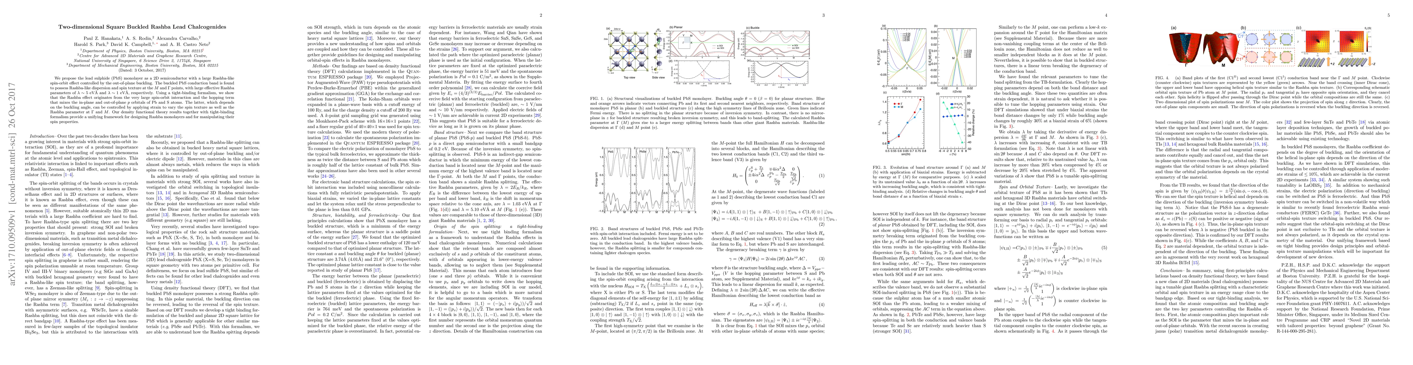 We propose the lead sulphide (PbS) monolayer as a 2D semiconductor with a large Rashba-like spin-orbit effect controlled by the out-of-plane buckling. The buckled PbS conduction band is found to possess Rashba-like dispersion and spin texture at the $M$ and $\Gamma$ points, with large effective Rashba parameters of $\lambda\sim5~$eV$\AA~$ and $\lambda\sim1~$eV$~\AA$, respectively. Using a tight-binding formalism, we show that the Rashba effect originates from the very large spin-orbit interaction and the hopping term that mixes the in-plane and out-of-plane $p$ orbitals of Pb and S atoms. The latter, which depends on the buckling angle, can be controlled by applying strain to vary the spin texture as well as the Rashba parameter at $\Gamma$ and $M$. Our density functional theory results together with tight-binding formalism provide a unifying framework for designing Rashba monolayers and for manipulating their spin properties.