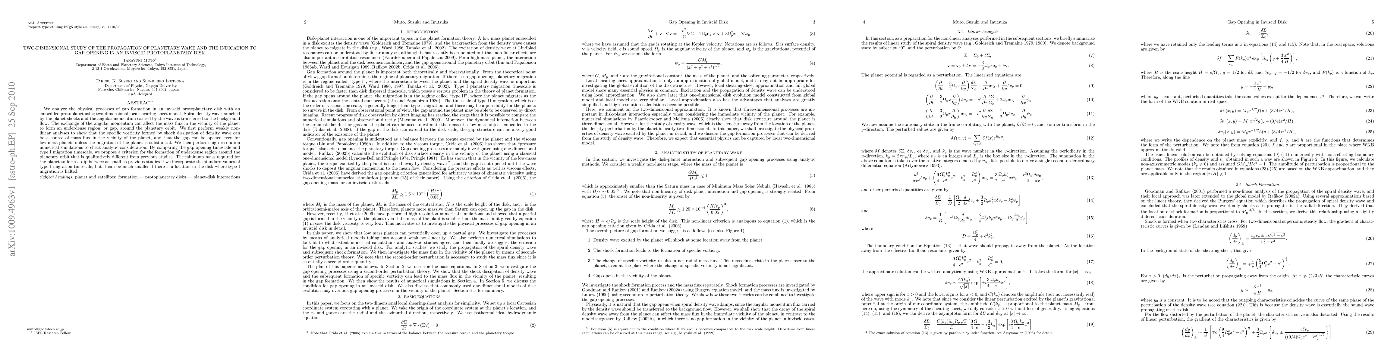 We analyze the physical processes of gap formation in an inviscid protoplanetary disk with an embedded protoplanet using two-dimensional local shearing-sheet model. Spiral density wave launched by the planet shocks and the angular momentum carried by the wave is transferred to the background flow. The exchange of the angular momentum can affect the mass flux in the vicinity of the planet to form an underdense region, or gap, around the planetary orbit. We first perform weakly non-linear analyses to show that the specific vorticity formed by shock dissipation of density wave can be a source of mass flux in the vicinity of the planet, and that the gap can be opened even for low-mass planets unless the migration of the planet is substantial. We then perform high resolution numerical simulations to check analytic consideration. By comparing the gap opening timescale and type I migration timescale, we propose a criterion for the formation of underdense region around the planetary orbit that is qualitatively different from previous studies. The minimum mass required for the planet to form a dip is twice as small as previous studies if we incorporate the standard values of type I migration timescale, but it can be much smaller if there is a location in the disk where type I migration is halted.