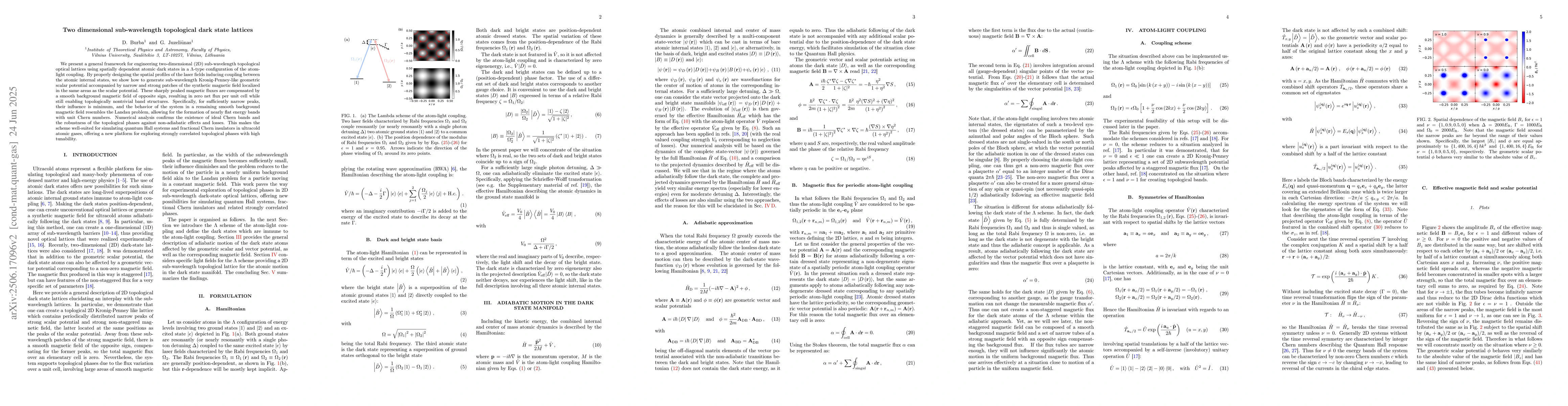 We present a general framework for engineering two-dimensional (2D) sub-wavelength topological optical lattices using spatially dependent atomic dark states in a $\Lambda$-type configuration of the atom-light coupling. By properly designing the spatial profiles of the laser fields inducing coupling between the atomic internal states, we show how to generate sub-wavelength Kronig-Penney-like geometric scalar potential accompanied by narrow and strong patches of the synthetic magnetic field localized in the same areas as the scalar potential. These sharply peaked magnetic fluxes are compensated by a smooth background magnetic field of opposite sign, resulting in zero net flux per unit cell while still enabling topologically nontrivial band structures. Specifically, for sufficiently narrow peaks, their influence is minimum, and the behavior of the system in a remaining smooth background magnetic field resembles the Landau problem, allowing for the formation of nearly flat energy bands with unit Chern numbers. Numerical analysis confirms the existence of ideal Chern bands and the robustness of the topological phases against non-adiabatic effects and losses. This makes the scheme well-suited for simulating quantum Hall systems and fractional Chern insulators in ultracold atomic gases, offering a new platform for exploring strongly correlated topological phases with high tunability.