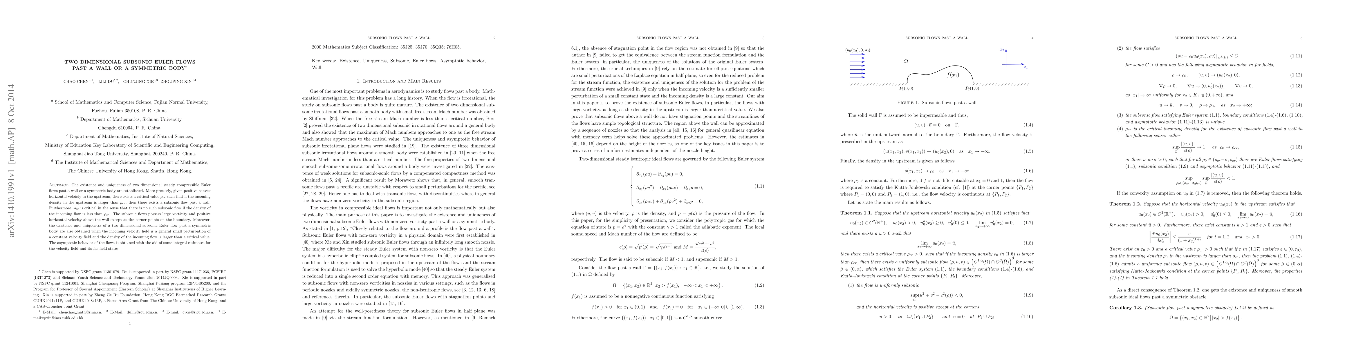 This paper establishes the existence and uniqueness of two-dimensional, steady, compressible Euler flows past a wall or a symmetric body under specific density and velocity conditions. It identifies a critical density threshold that determines the formation of subsonic flows.