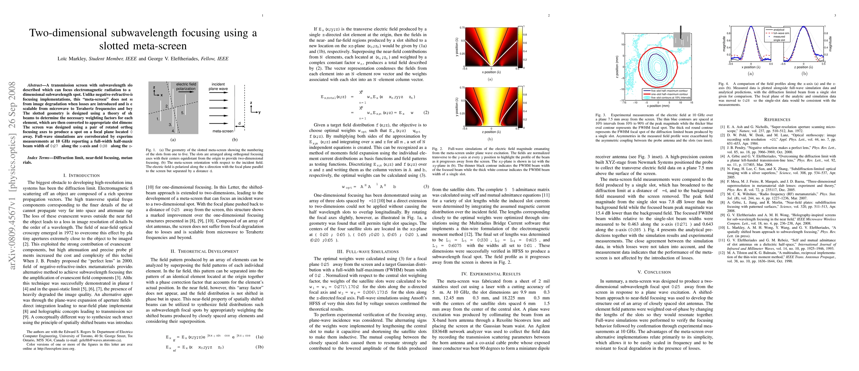A transmission screen with subwavelength slots is described which can focus electromagnetic radiation to a two-dimensional subwavelength spot. Unlike negative-refractive-index focusing implementations, this "meta-screen" does not suffer from image degradation when losses are introduced and is easily scalable from microwave to Terahertz frequencies and beyond. The slotted geometry is designed using a theory of shifted beams to determine the necessary weighting factors for each slot element, which are then converted to appropriate slot dimensions. The screen was designed using a pair of rotated orthogonal focusing axes to produce a spot on a focal plane located 0.25 \lambda away. Full-wave simulations are corroborated by experimental measurements at 10 GHz reporting a full-width half-maximum beam width of 0.27 \lambda along the x-axis and 0.38 \lambda along the z-axis.