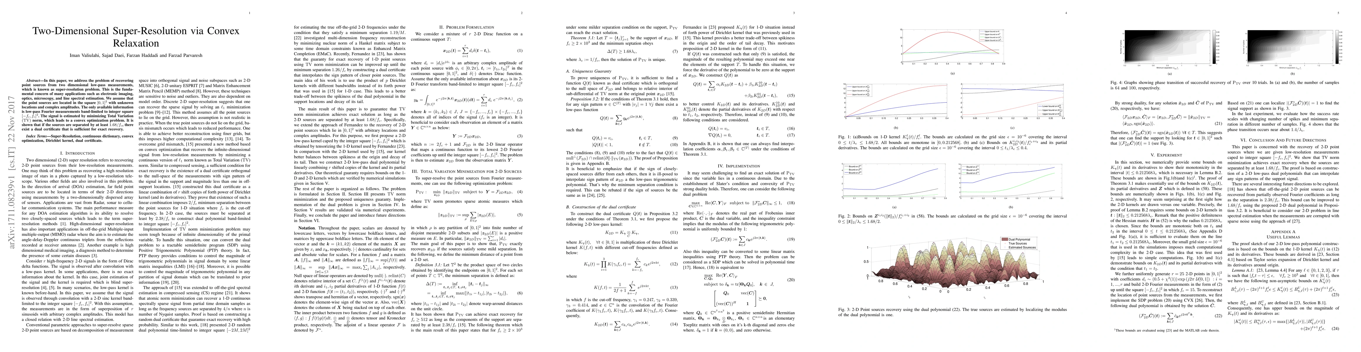 In this paper, we address the problem of recovering point sources from two dimensional low-pass measurements, which is known as super-resolution problem. This is the fundamental concern of many applications such as electronic imaging, optics, microscopy, and line spectral estimation. We assume that the point sources are located in the square $[0,1]^2$ with unknown locations and complex amplitudes. The only available information is low-pass Fourier measurements band-limited to integer square $[-f_c,f_c]^2$. The signal is estimated by minimizing Total Variation $(\mathrm{TV})$ norm, which leads to a convex optimization problem. It is shown that if the sources are separated by at least $1.68/f_c$, there exist a dual certificate that is sufficient for exact recovery.