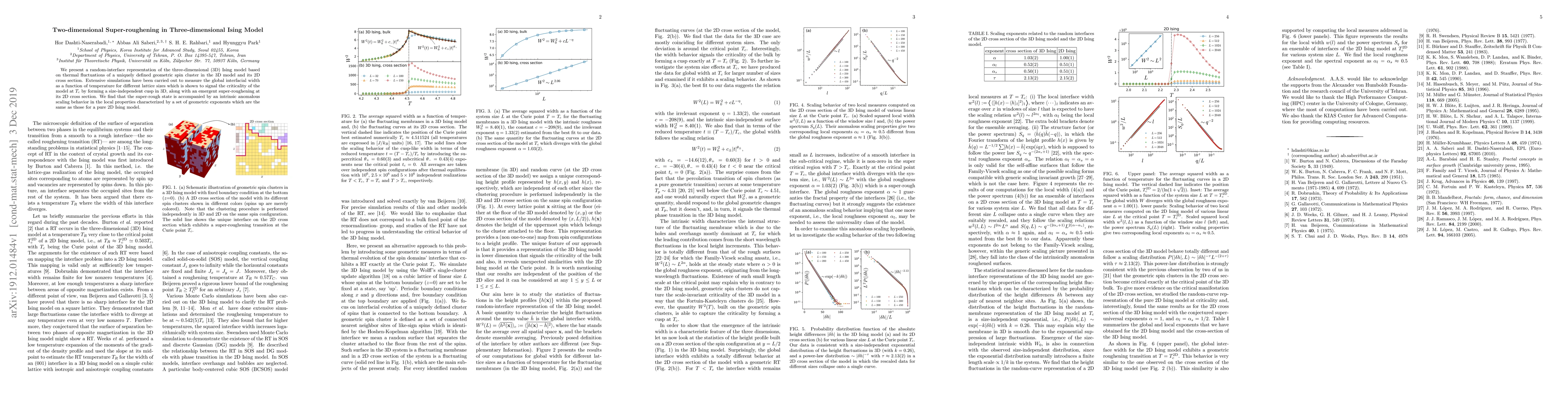 This paper investigates the three-dimensional Ising model through a random-interface representation, revealing a size-independent cusp in the global interfacial width signaling criticality at $T_c$. The study uncovers emergent super-roughening in the 2D cross section, accompanied by anomalous scaling behavior in local properties akin to those in a pure 2D Ising model.