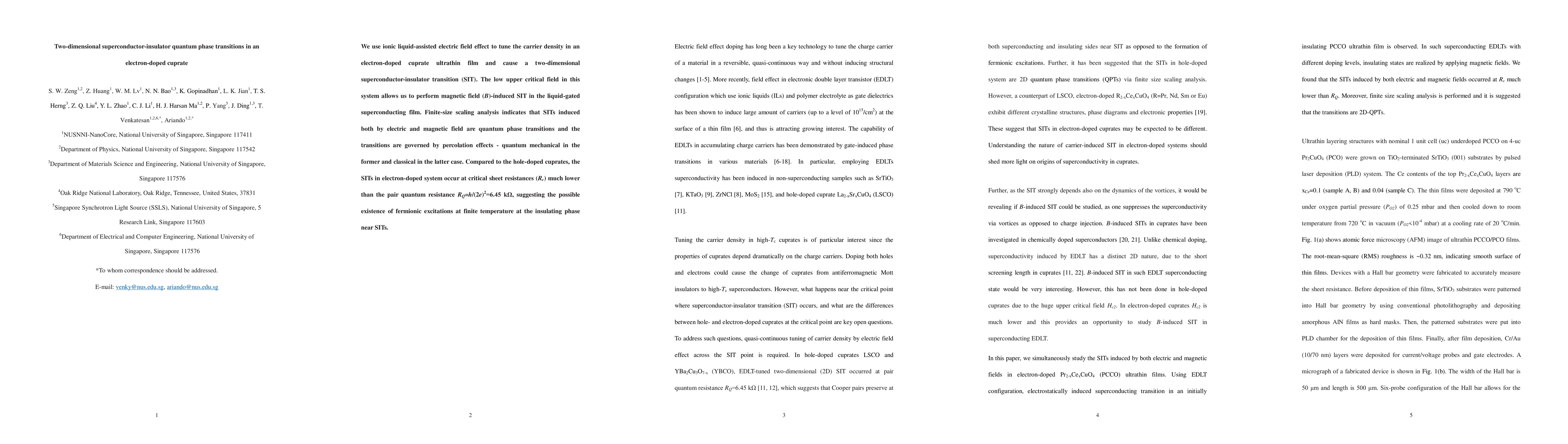 This study investigates a superconductor-insulator transition in electron-doped cuprate ultrathin films using an ionic liquid-assisted electric field effect. The transition, induced by both electric and magnetic fields, is identified as a quantum phase transition governed by percolation effects, with different behaviors in the electron-doped versus hole-doped systems.