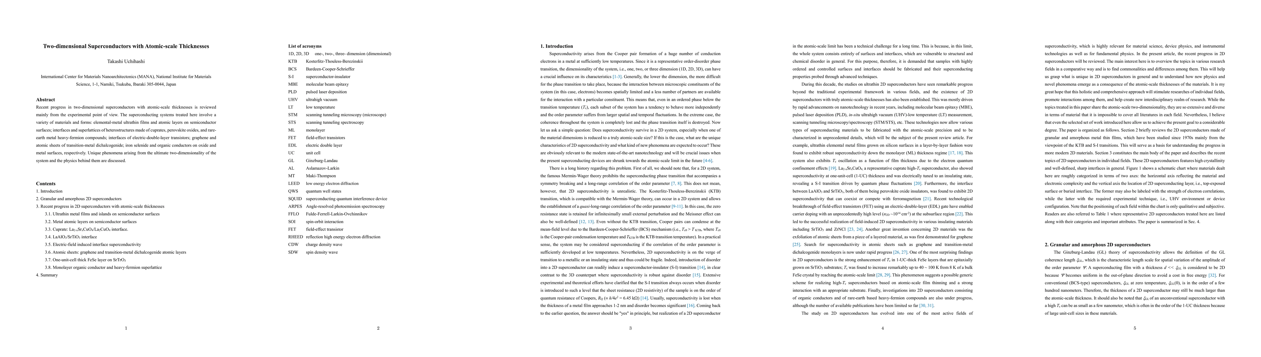 Recent progress in two-dimensional superconductors with atomic-scale thicknesses is reviewed mainly from the experimental point of view. The superconducting systems treated here involve a variety of materials and forms: elemental-metal ultrathin films and atomic layers on semiconductor surfaces; interfaces and superlattices of heterostructures made of cuprates, perovskite oxides, and rare-earth metal heavy-fermion compounds; interfaces of electric-double-layer transistors; graphene and atomic sheets of transition-metal dichalcogenide; iron selenide and organic conductors on oxide and metal surfaces, respectively. Unique phenomena arising from the ultimate two-dimensionality of the system and the physics behind them are discussed.