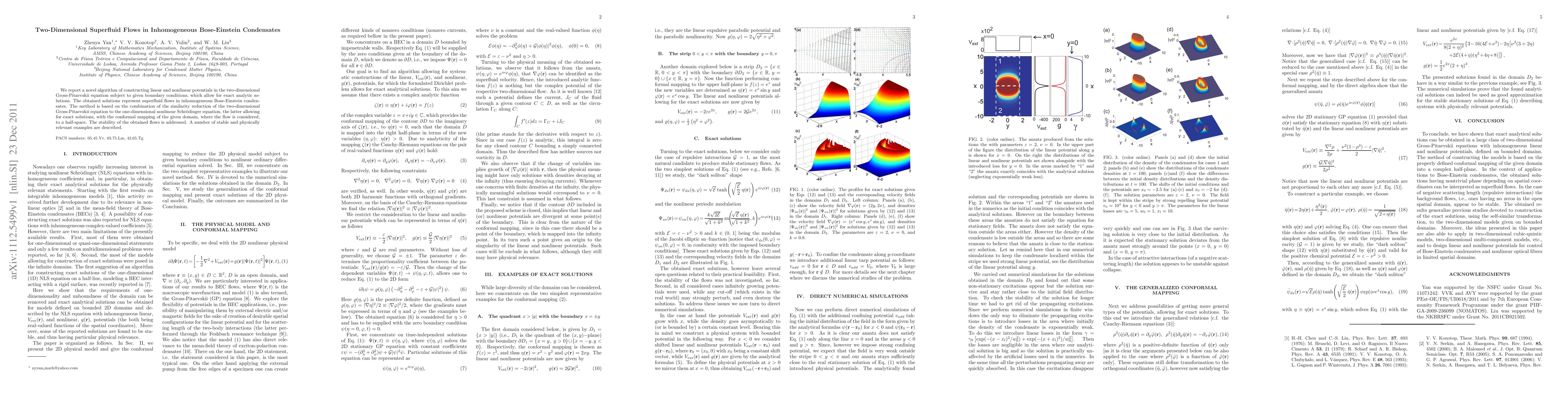 We report a novel algorithm of constructing linear and nonlinear potentials in the two-dimensional Gross-Pitaevskii equation subject to given boundary conditions, which allow for exact analytic solutions. The obtained solutions represent superfluid flows in inhomogeneous Bose-Einstein condensates. The method is based on the combination of the similarity reduction of the two-dimensional Gross-Pitaevskii equation to the one-dimensional nonlinear Schrodinger equation, the latter allowing for exact solutions, with the conformal mapping of the given domain, where the flow is considered, to a half-space. The stability of the obtained flows is addressed. A number of stable and physically relevant examples are described.