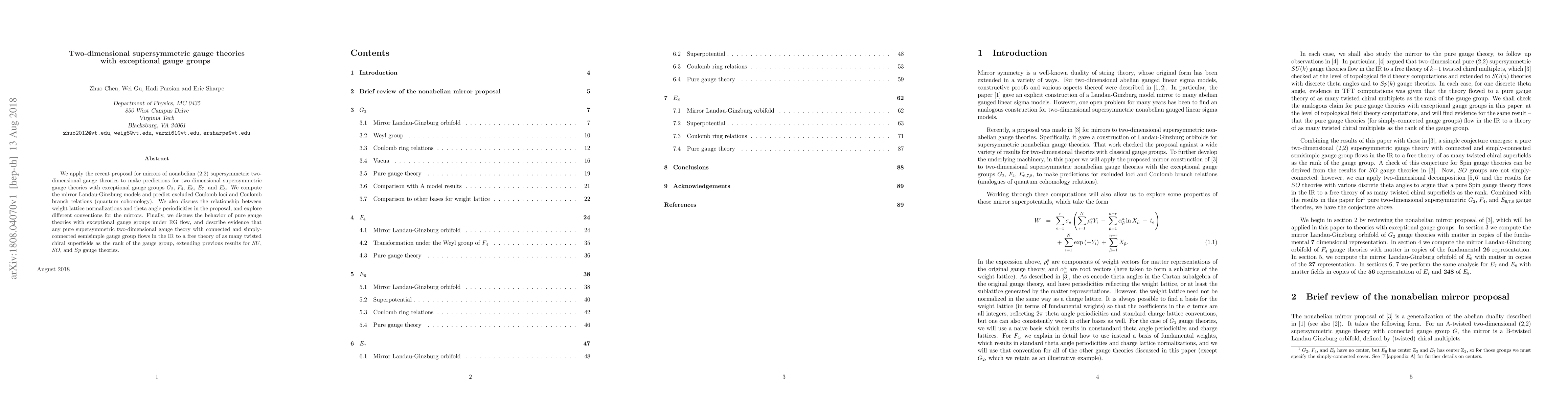 This paper investigates two-dimensional supersymmetric gauge theories featuring exceptional gauge groups (G2, F4, E6, E7, E8) using mirror symmetry techniques. It predicts excluded Coulomb loci and Coulomb branch relations, discusses normalization conventions, and explores the behavior of pure gauge theories under RG flow, suggesting they IR-flow to free twisted chiral superfields.