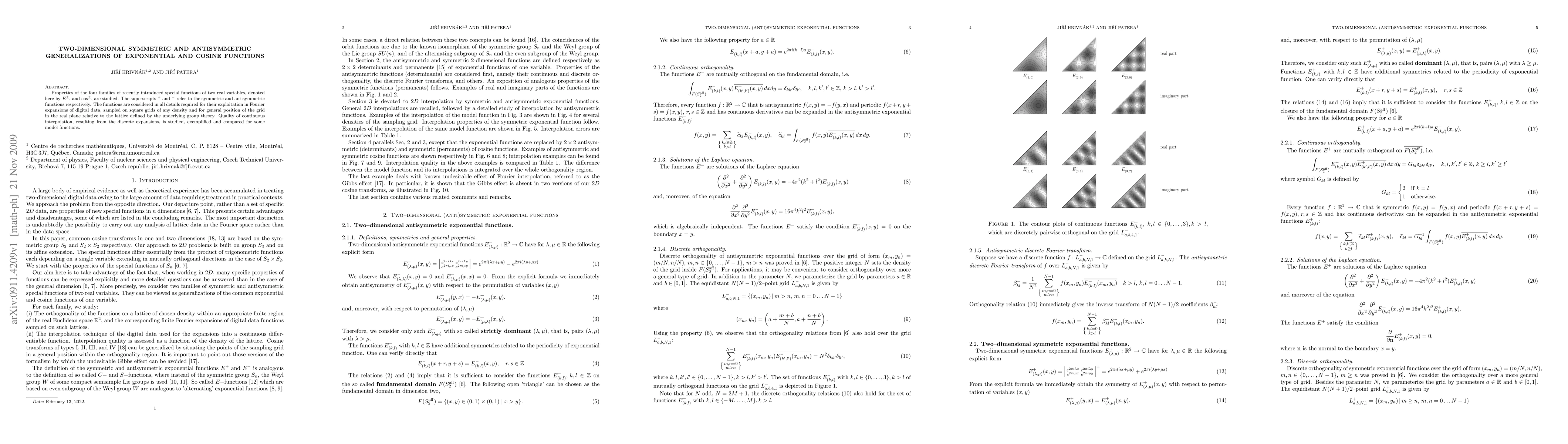 Properties of the four families of recently introduced special functions of two real variables, denoted here by $E^\pm$, and $\cos^\pm$, are studied. The superscripts $^+$ and $^-$ refer to the symmetric and antisymmetric functions respectively. The functions are considered in all details required for their exploitation in Fourier expansions of digital data, sampled on square grids of any density and for general position of the grid in the real plane relative to the lattice defined by the underlying group theory. Quality of continuous interpolation, resulting from the discrete expansions, is studied, exemplified and compared for some model functions.