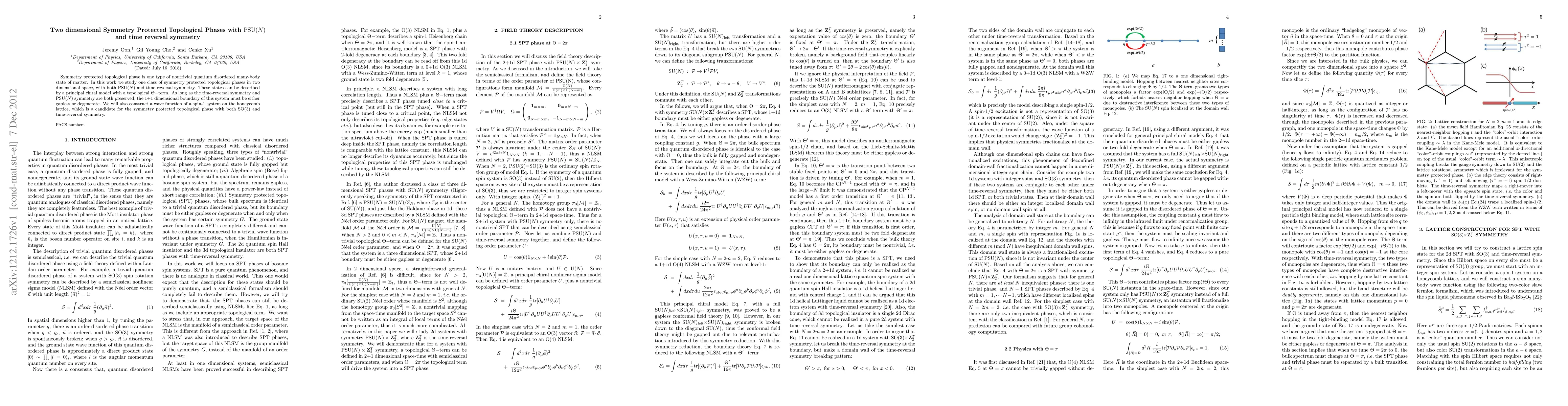 This paper investigates two-dimensional symmetry protected topological phases under PSU(N) and time reversal symmetry, describing them via a principal chiral model with a topological Theta-term. It finds that the 1+1 dimensional boundary of such systems must be gapless or degenerate when both symmetries are preserved, and proposes a spin-1 honeycomb lattice wave function as a candidate for the topological phase.