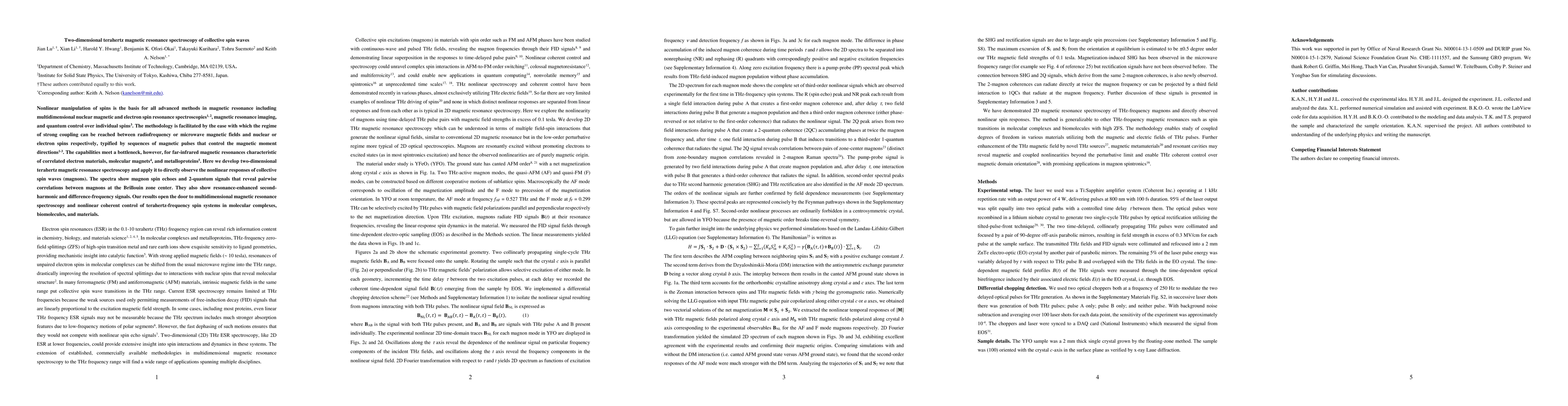 This paper introduces a two-dimensional terahertz magnetic resonance spectroscopy technique for observing nonlinear responses of collective spin waves (magnons) in correlated electron materials. The method reveals magnon spin echoes, 2-quantum signals, and resonance-enhanced harmonics, offering potential for multidimensional magnetic resonance and nonlinear control of terahertz spin systems in various materials.