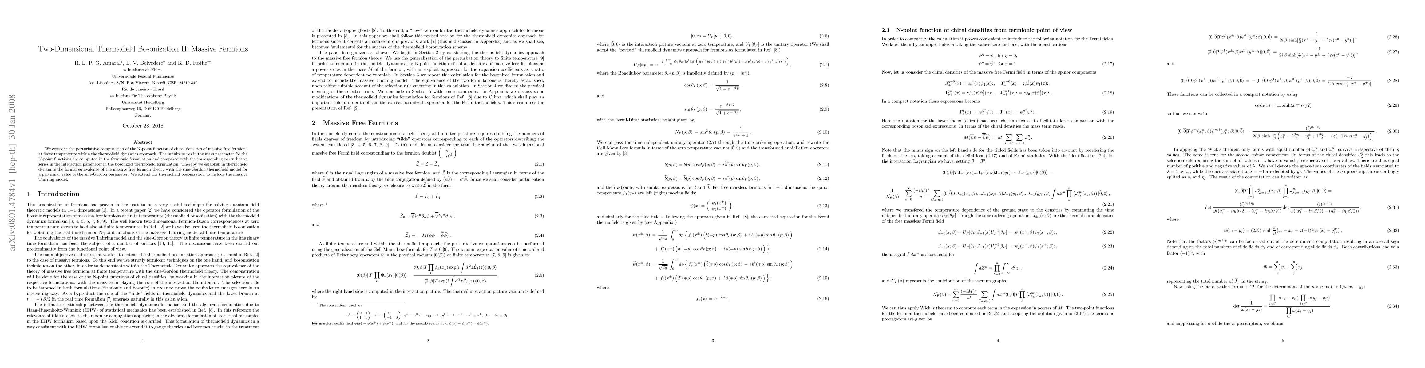 This paper explores the perturbative computation of N-point functions of chiral densities for massive free fermions at finite temperature using thermofield dynamics. It establishes the equivalence between the massive free fermion theory and the sine-Gordon thermofield model, and extends thermofield bosonization to include the massive Thirring model.