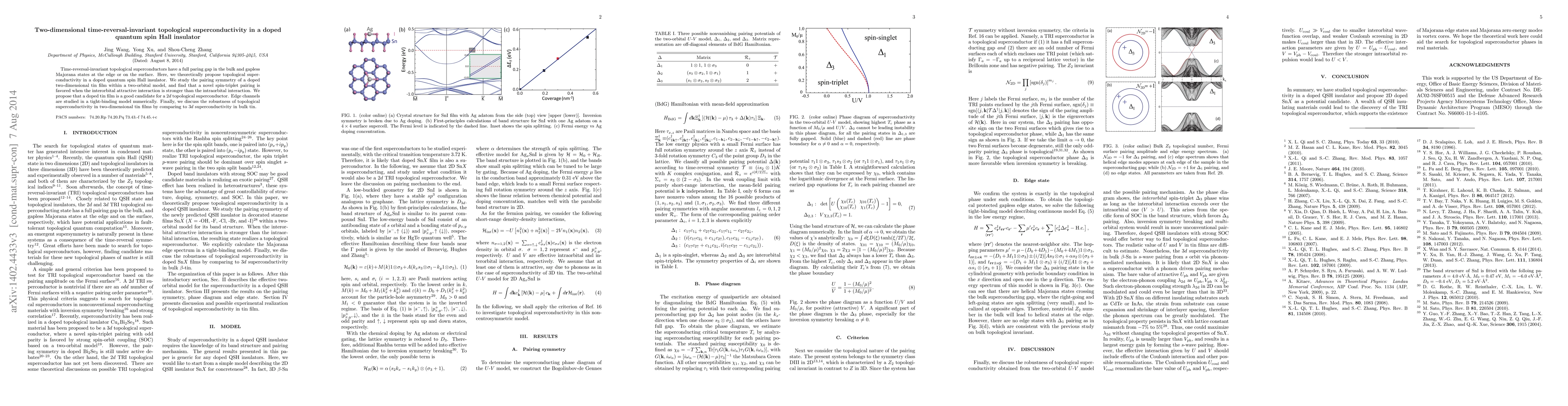 This paper proposes theoretically that doped quantum spin Hall insulators can exhibit two-dimensional time-reversal-invariant topological superconductivity. It demonstrates that such topological superconductivity can occur in SnX films when intraorbital interactions dominate over interorbital ones, and numerically verifies the presence of edge Majorana states.