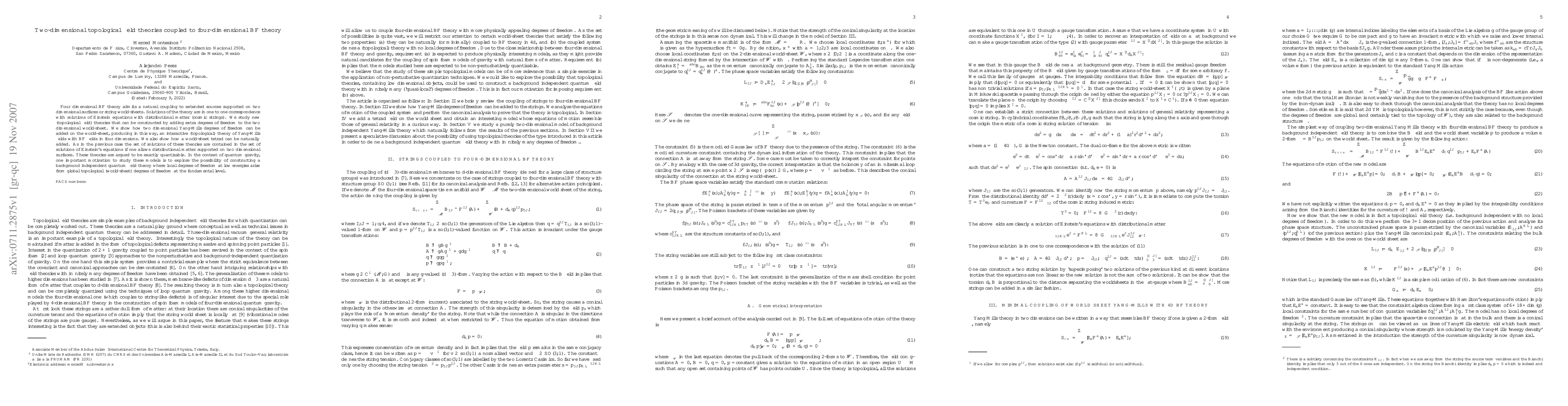 This paper constructs new topological field theories by coupling two-dimensional topological field theories to four-dimensional BF theory, integrating Yang-Mills fields on string world-sheets and tetrads. These theories, which correspond to solutions of Einstein’s equations with cosmic strings, are argued to be exactly quantizable, potentially offering a background-independent quantum field theory framework.