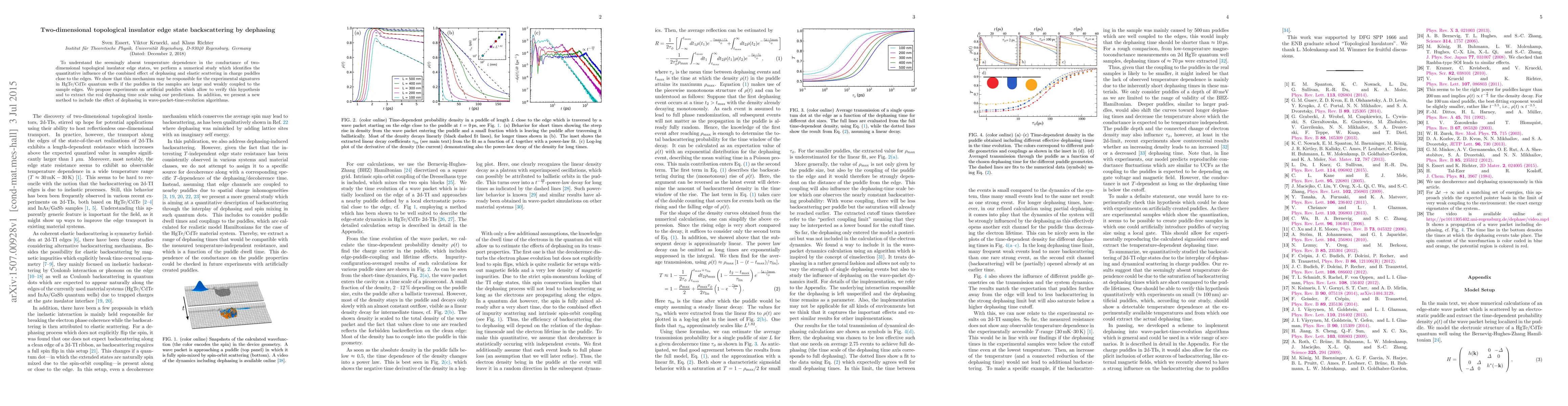 To understand the seemingly absent temperature dependence in the conductance of two-dimensional topological insulator edge states, we perform a numerical study which identifies the quantitative influence of the combined effect of dephasing and elastic scattering in charge puddles close to the edges. We show that this mechanism may be responsible for the experimental signatures in HgTe/CdTe quantum wells if the puddles in the samples are large and weakly coupled to the sample edges. We propose experiments on artificial puddles which allow to verify this hypothesis and to extract the real dephasing time scale using our predictions. In addition, we present a new method to include the effect of dephasing in wave-packet-time-evolution algorithms.