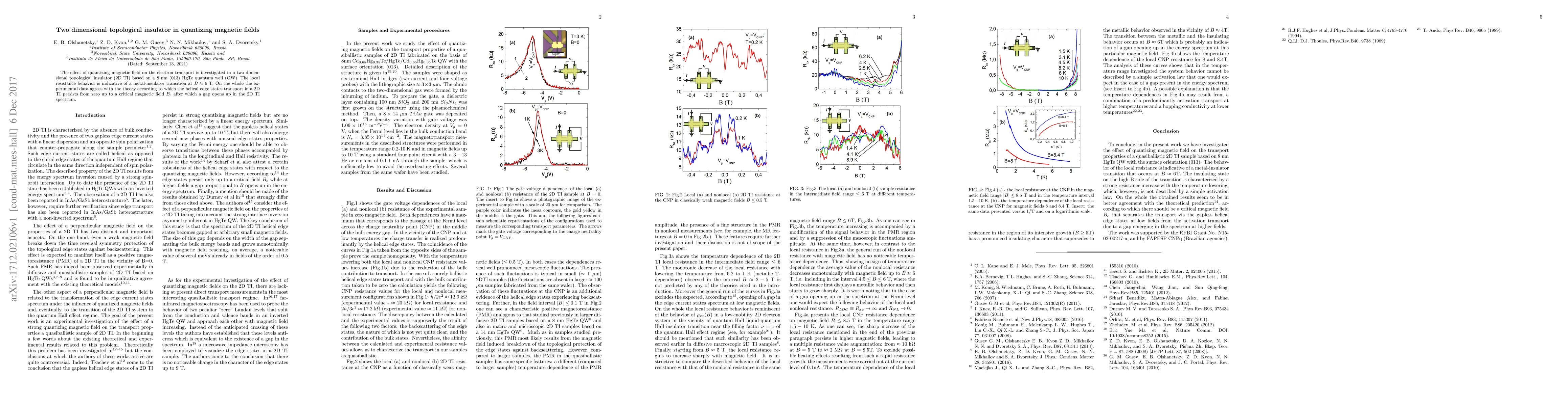This study investigates electron transport in a 2D topological insulator under quantizing magnetic fields, revealing a metal-insulator transition at approximately 6 T. Experimental data supports theoretical predictions that helical edge states persist up to a critical magnetic field $B_c$, beyond which a spectral gap forms.