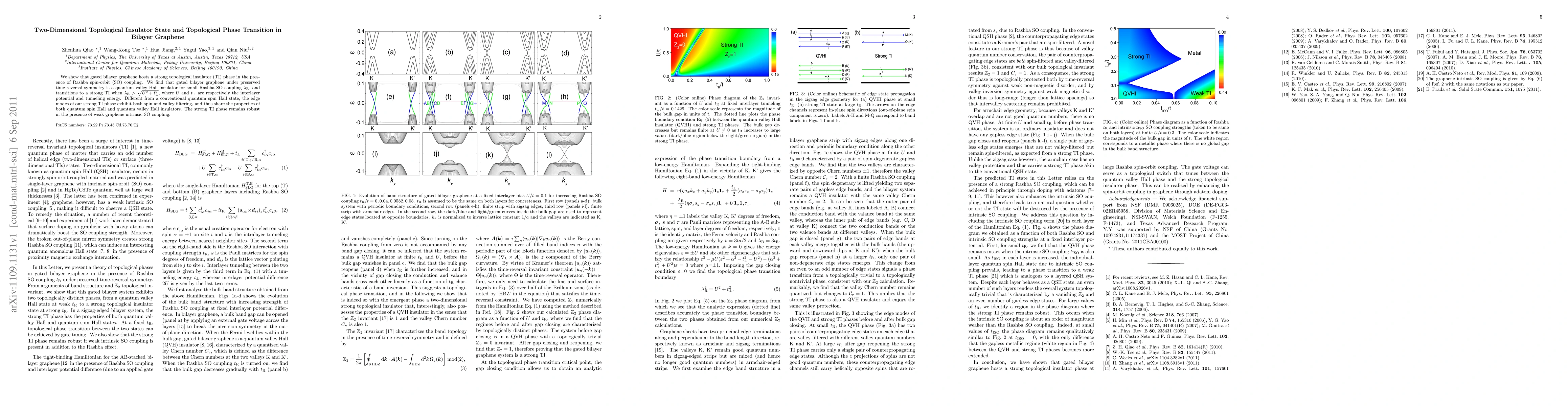 This study reveals that gated bilayer graphene exhibits a topological insulator state with quantum valley Hall properties under small Rashba spin-orbit coupling, transitioning to a robust strong topological insulator phase when the coupling exceeds a certain threshold, characterized by unique spin and valley filtering edge modes.