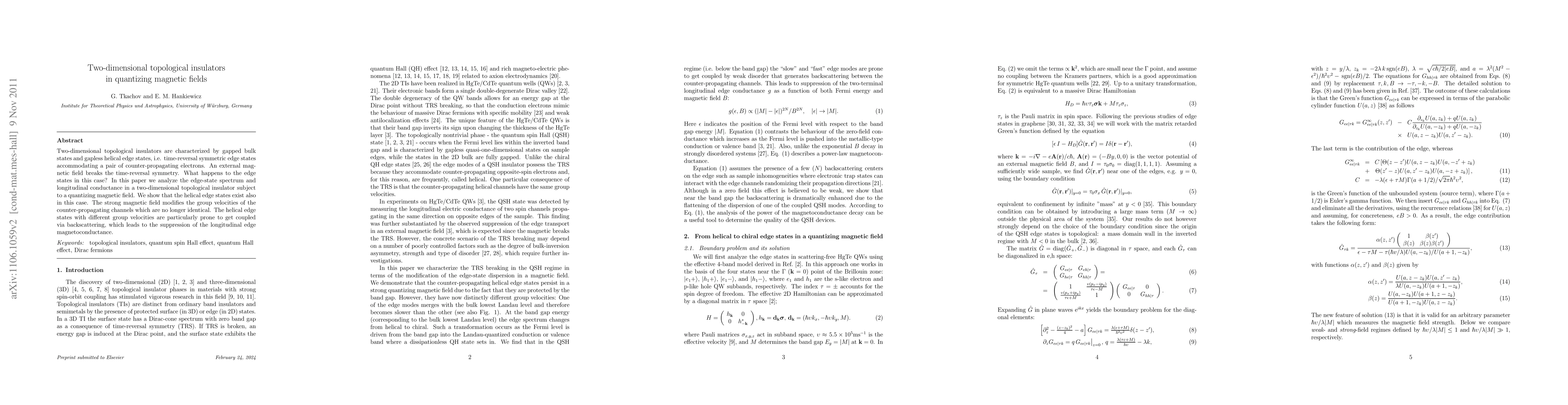 This research investigates how a quantizing magnetic field affects the helical edge states in two-dimensional topological insulators, showing that despite the symmetry breaking, the edge states persist but with modified group velocities. The paper concludes that the differential group velocities lead to suppressed longitudinal magnetoconductance due to increased backscattering.