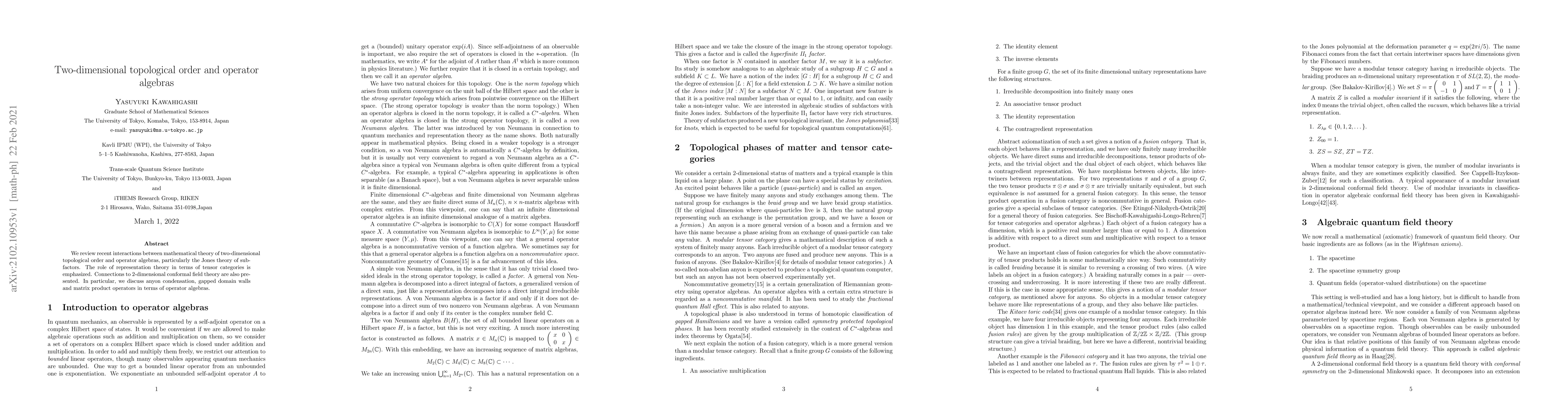 This paper reviews the interplay between two-dimensional topological order theory and operator algebras, highlighting representation theory through tensor categories and its links to 2-dimensional conformal field theory. Key topics include anyon condensation, gapped domain walls, and matrix product operators, explained via operator algebra.