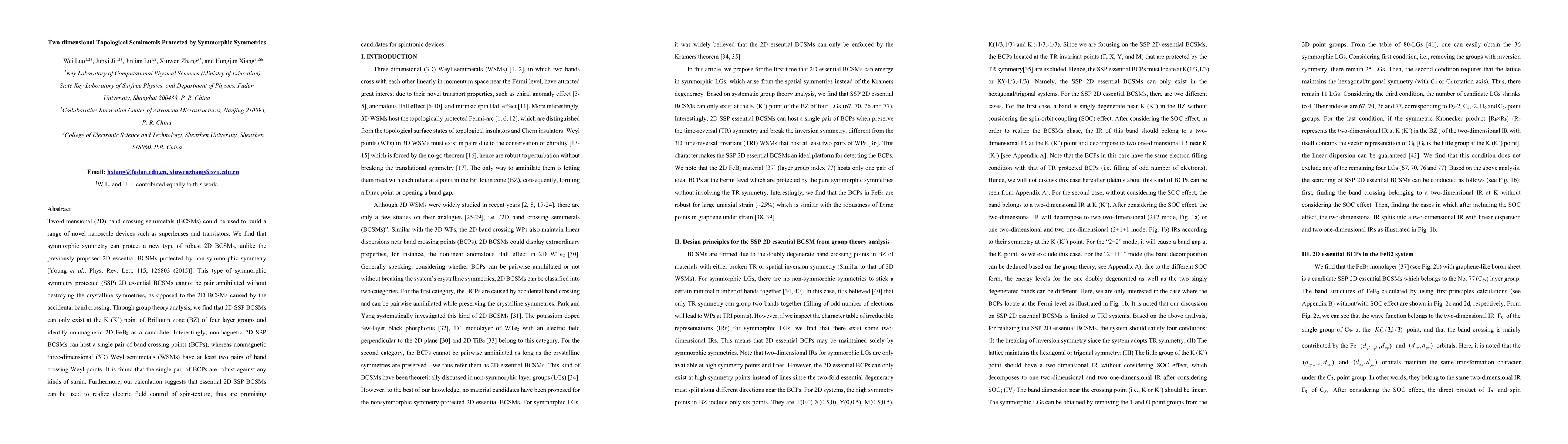 This paper explores the existence of robust two-dimensional topological semimetals (BCSMs) protected by symmorphic symmetries, unlike the previously known BCSMs protected by non-symmorphic symmetry. The authors identify nonmagnetic 2D FeB2 as a candidate for these symmorphic symmetry protected BCSMs, which can host a single pair of band crossing points and are robust against strain, making them promising for spintronic devices.