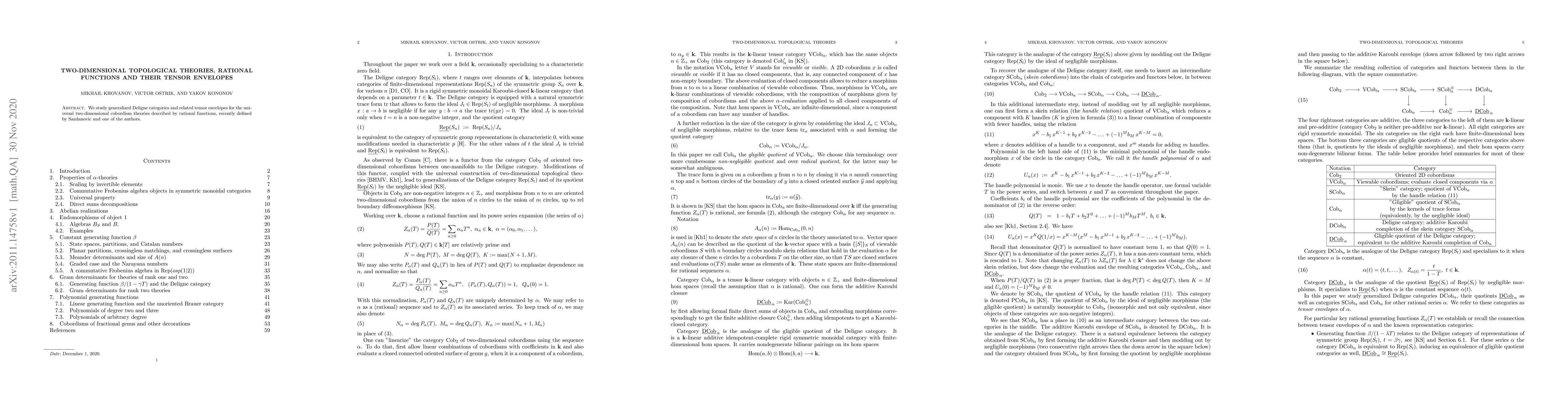 We study generalized Deligne categories and related tensor envelopes for the universal two-dimensional cobordism theories described by rational functions, recently defined by Sazdanovic and one of the authors.